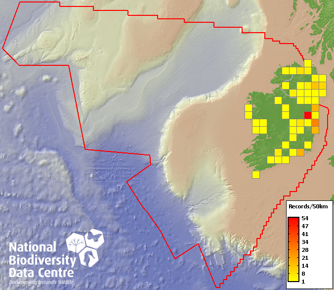 Distribution of the number of records recorded within each 10km grid square (ITM).Marine Map - 50km