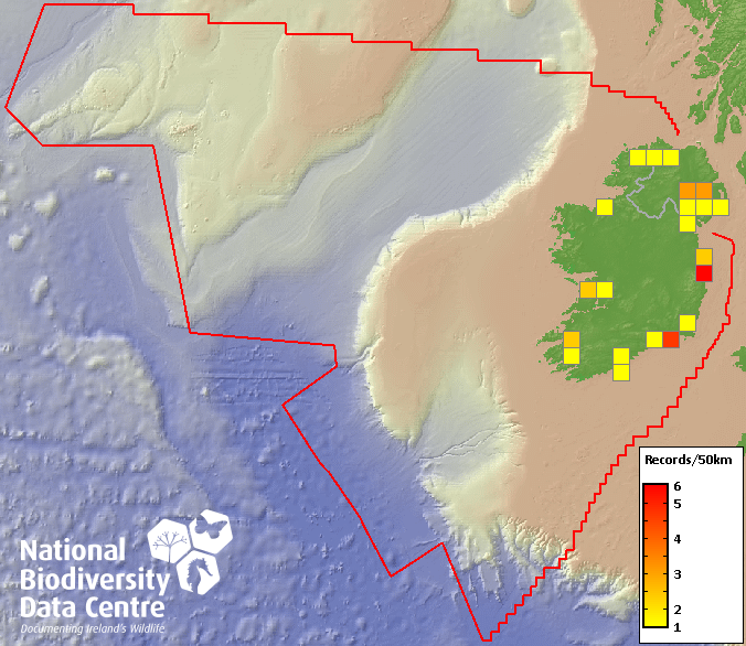Distribution of the number of records recorded within each 10km grid square (ITM).Marine Map - 50km
