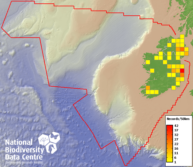 Distribution of the number of records recorded within each 10km grid square (ITM).Marine Map - 50km