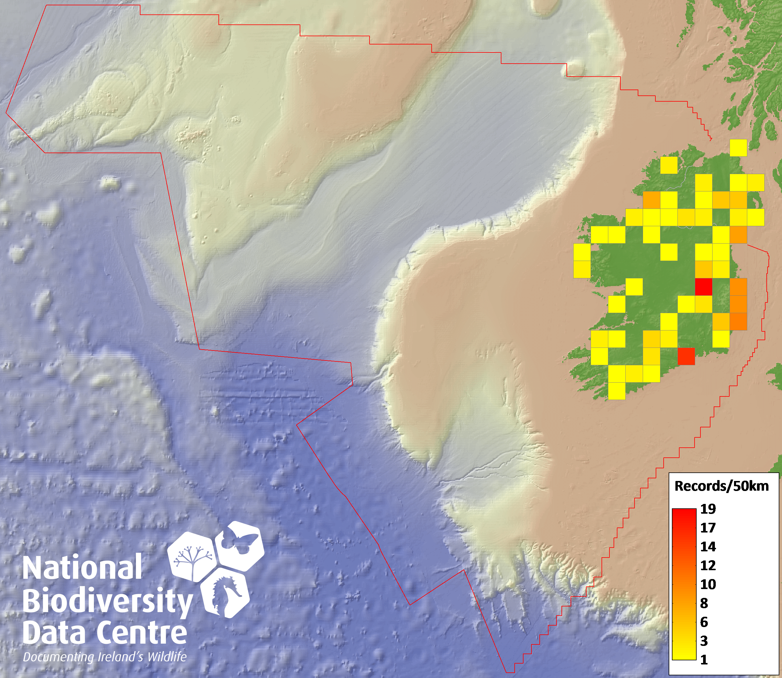 Distribution of the number of records recorded within each 10km grid square (ITM).Marine Map - 50km