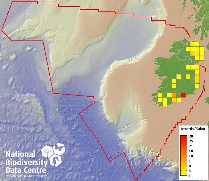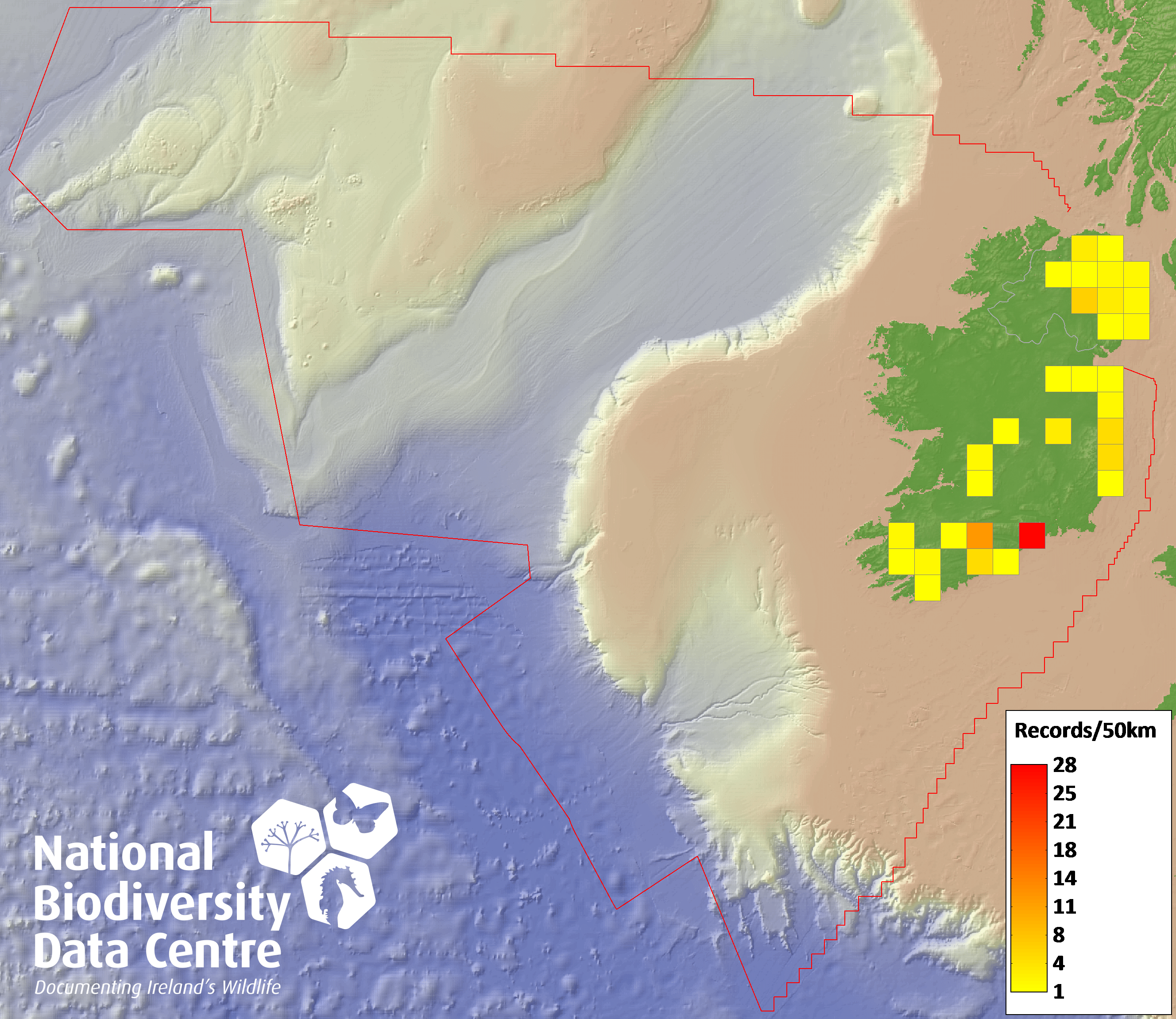 Distribution of the number of records recorded within each 10km grid square (ITM).Marine Map - 50km