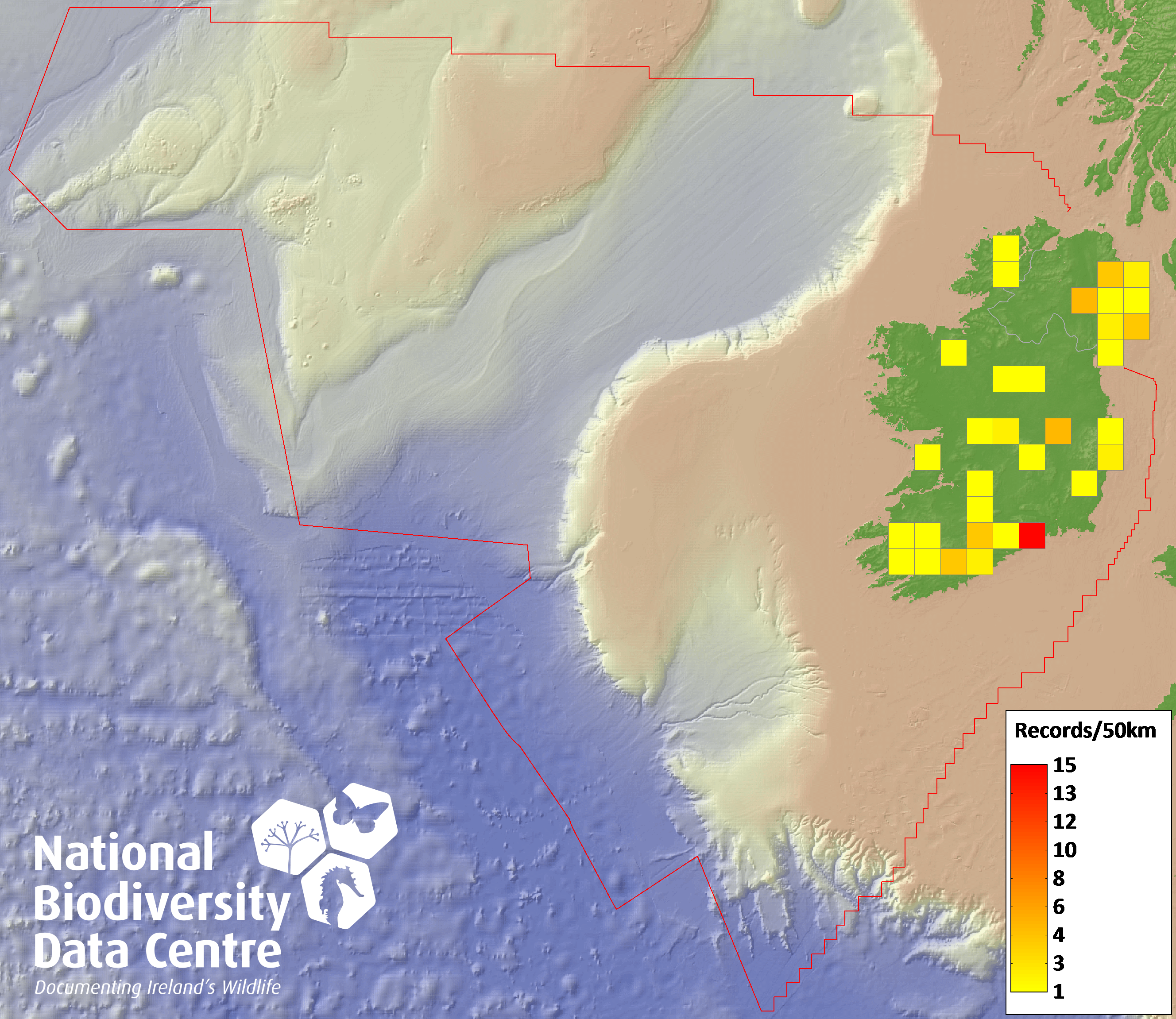 Distribution of the number of records recorded within each 10km grid square (ITM).Marine Map - 50km