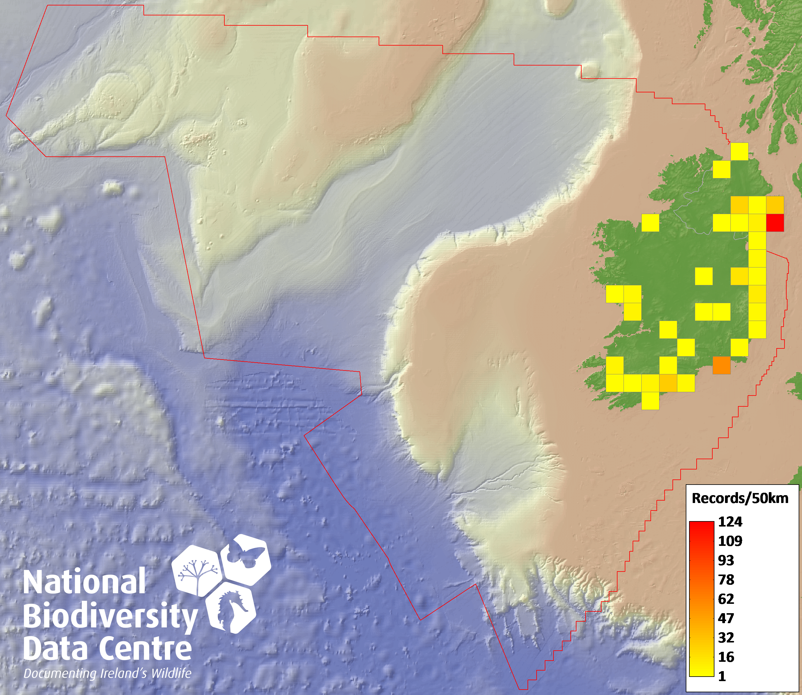 Distribution of the number of records recorded within each 10km grid square (ITM).Marine Map - 50km