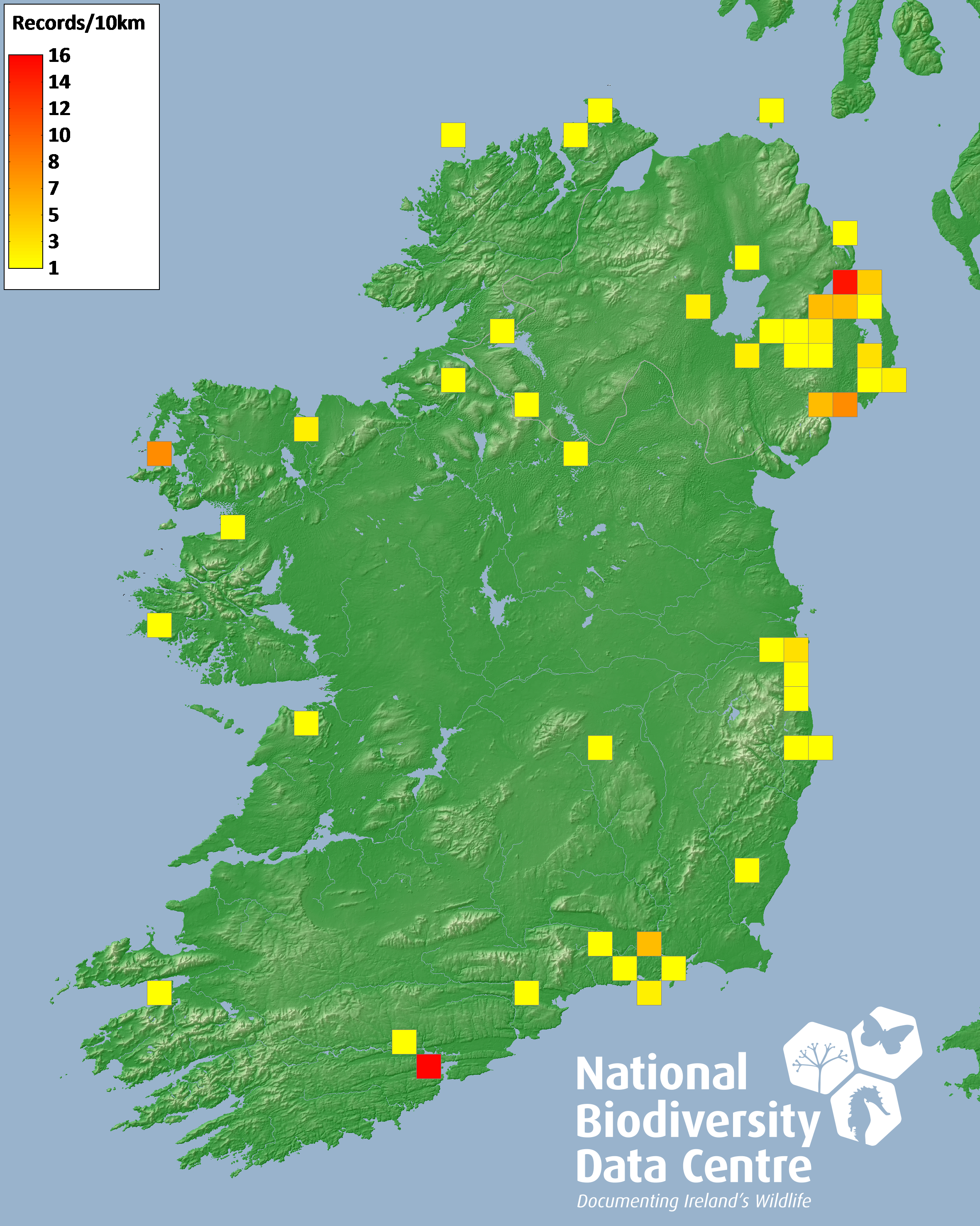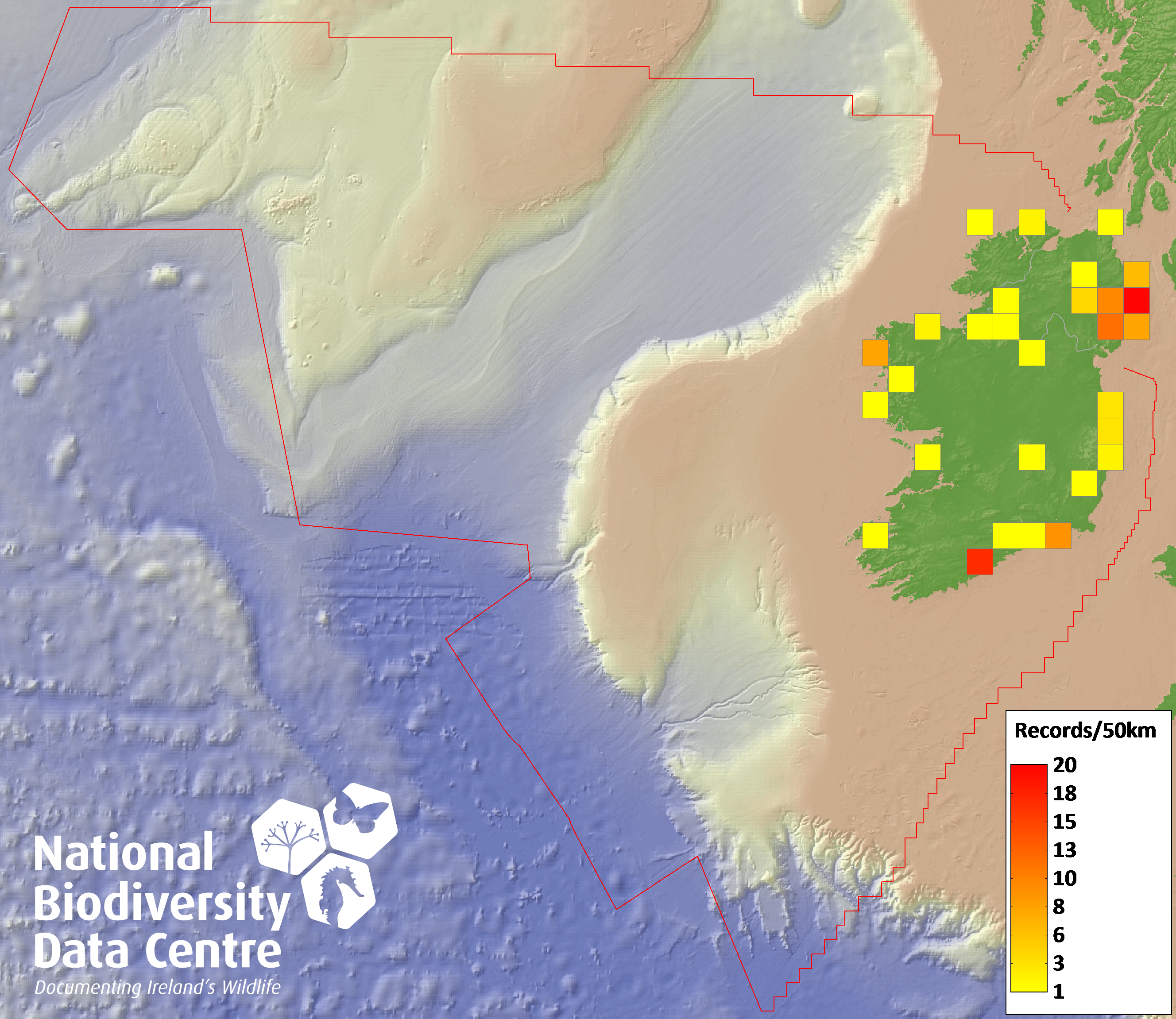 Distribution of the number of records recorded within each 10km grid square (ITM).Marine Map - 50km