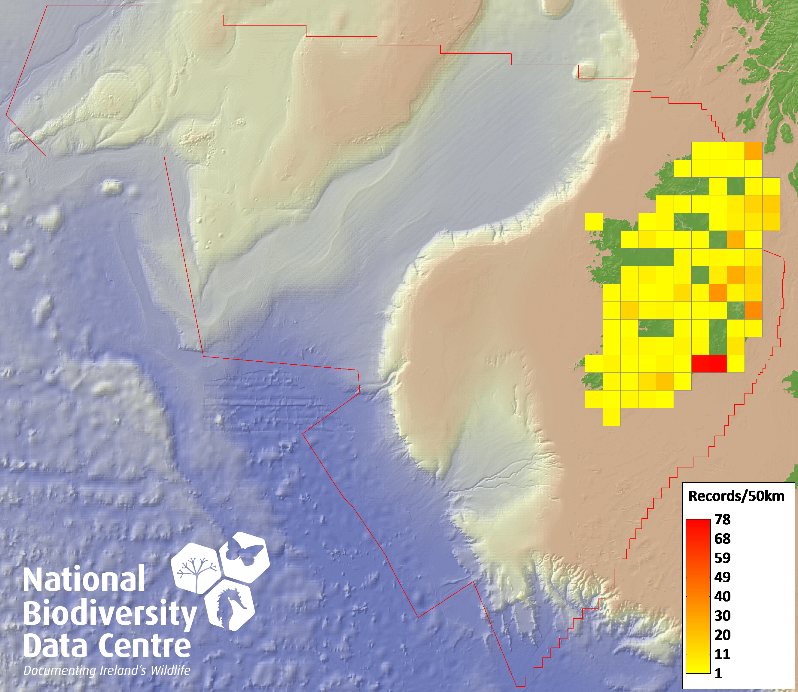 Distribution of the number of records recorded within each 10km grid square (ITM).Marine Map - 50km