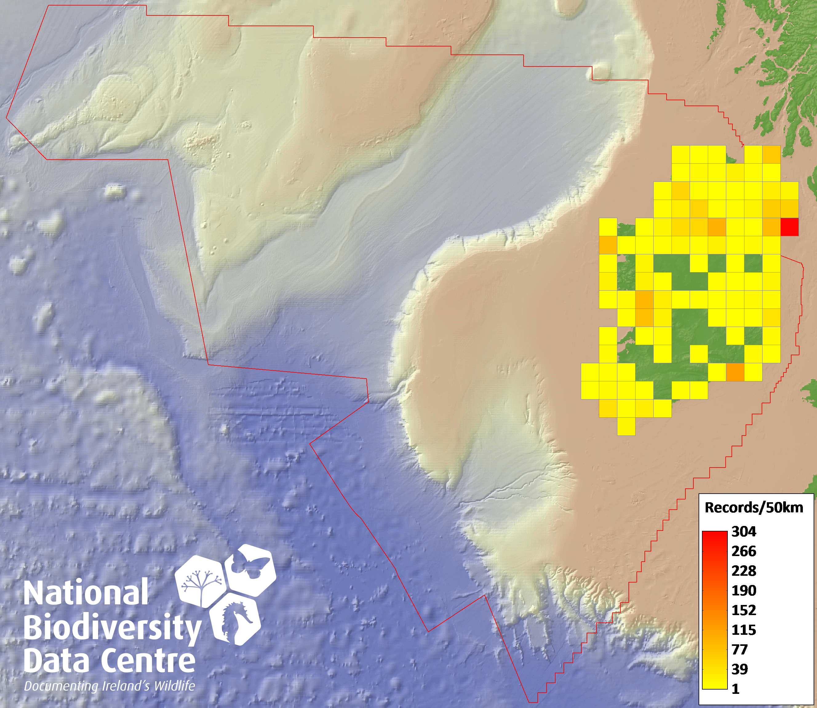 Distribution of the number of records recorded within each 10km grid square (ITM).Marine Map - 50km