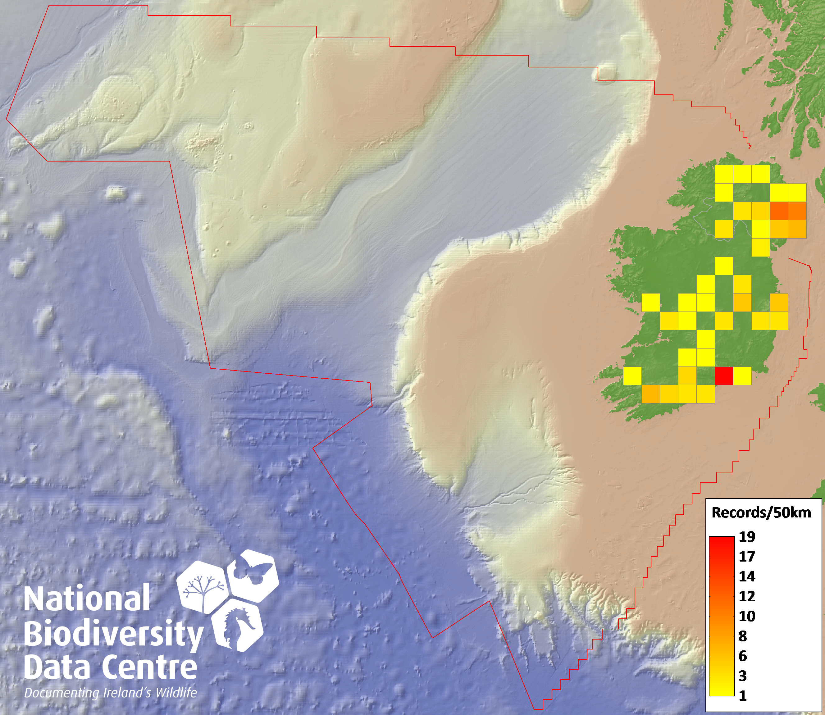 Distribution of the number of records recorded within each 10km grid square (ITM).Marine Map - 50km