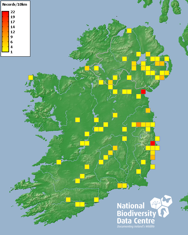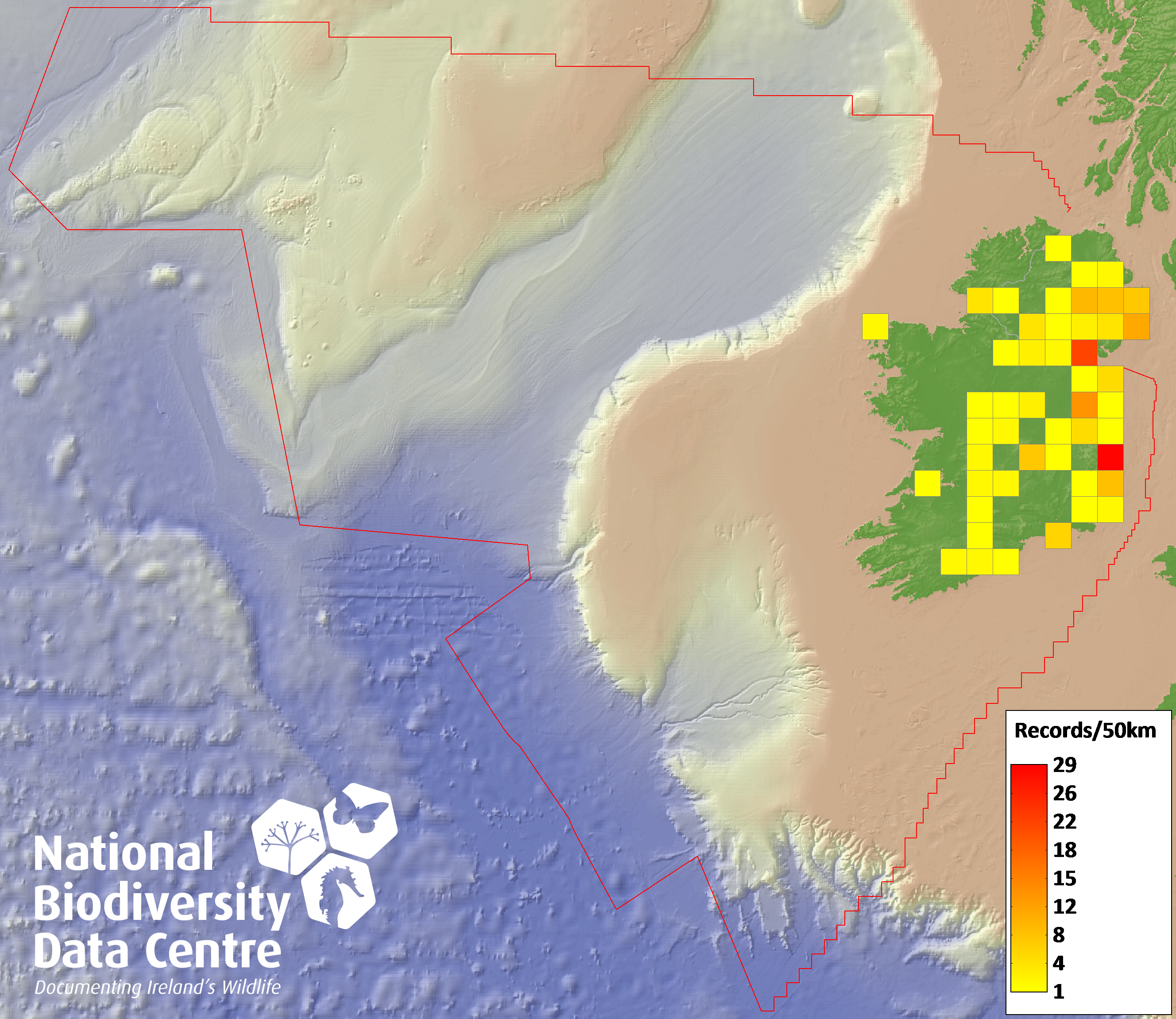 Distribution of the number of records recorded within each 10km grid square (ITM).Marine Map - 50km