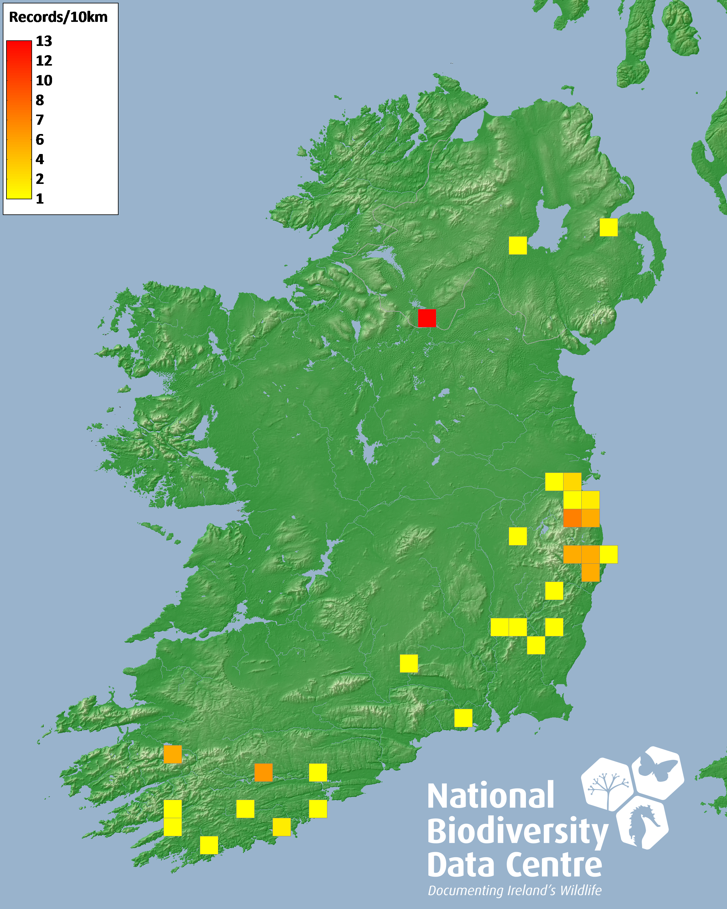 Distribution of the number of records recorded within each 10km grid square (ITM).Marine Map - 50km