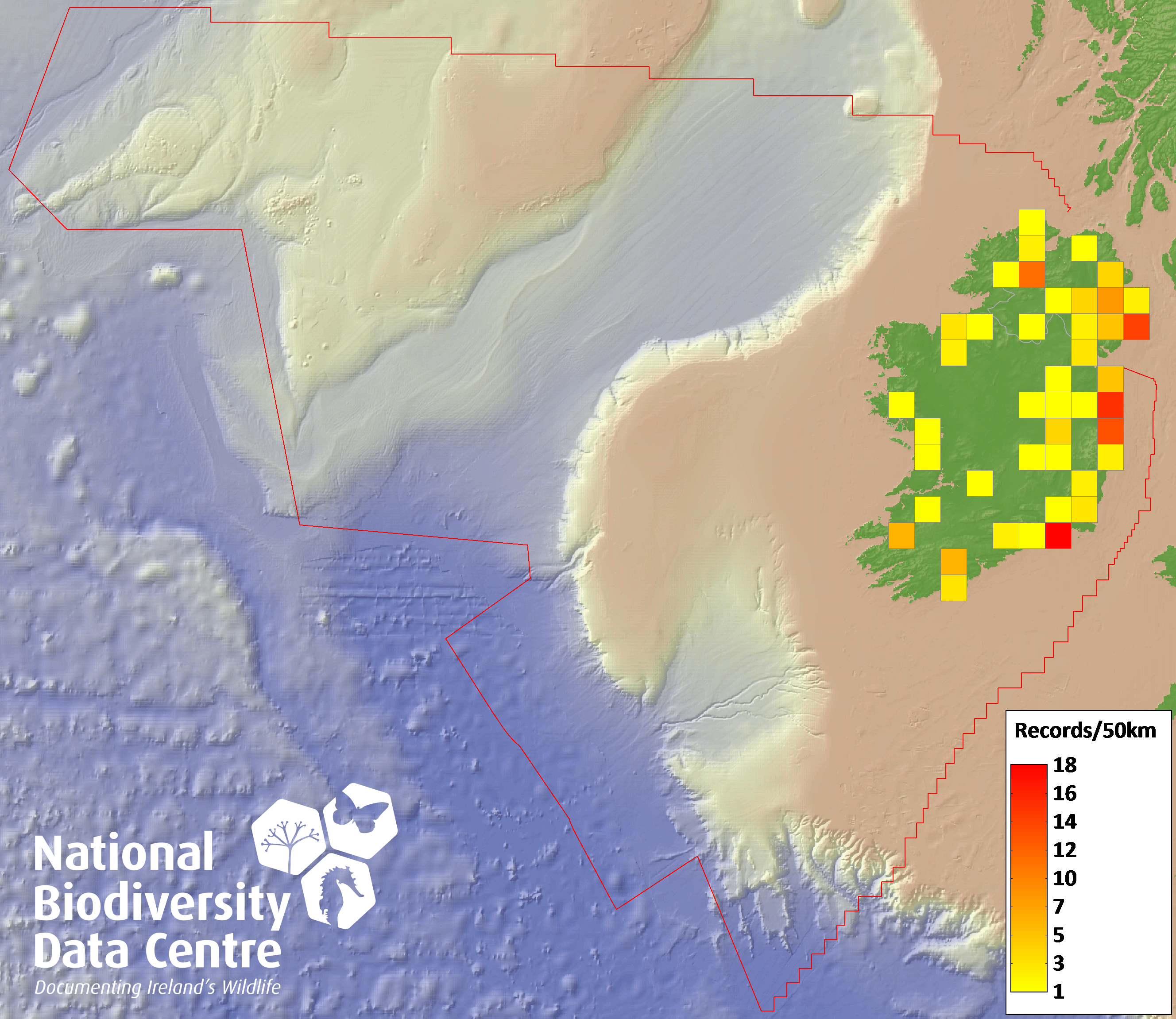 Distribution of the number of records recorded within each 10km grid square (ITM).Marine Map - 50km