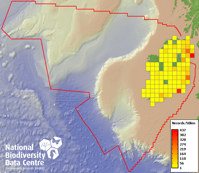 Distribution of the number of records recorded within each 10km grid square (ITM).Marine Map - 50km
