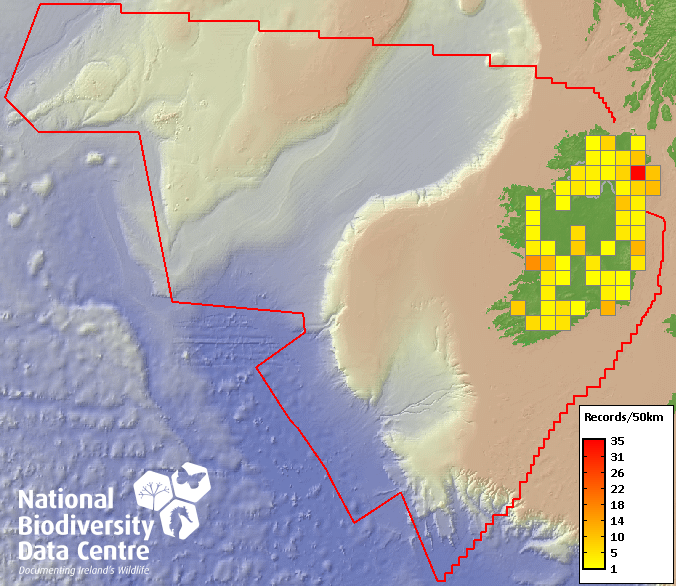 Distribution of the number of records recorded within each 10km grid square (ITM).Marine Map - 50km