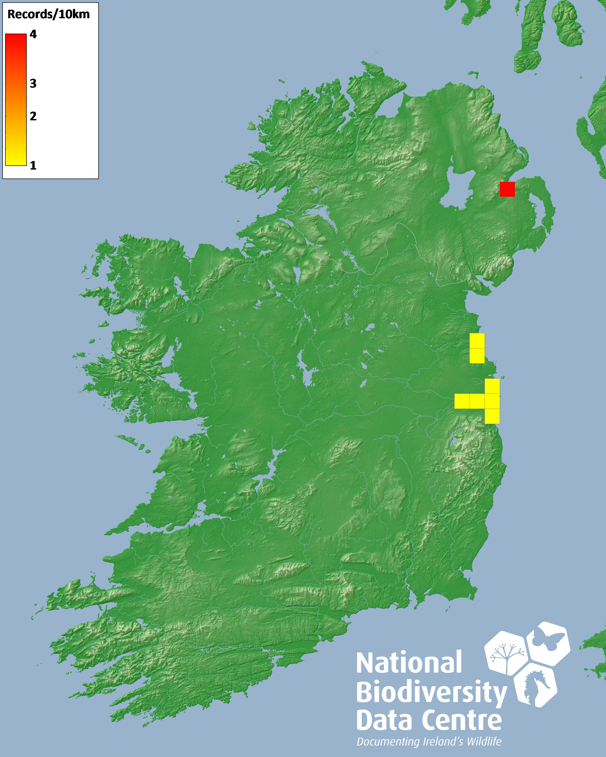Distribution of the number of records recorded within each 10km grid square (ITM).Marine Map - 50km