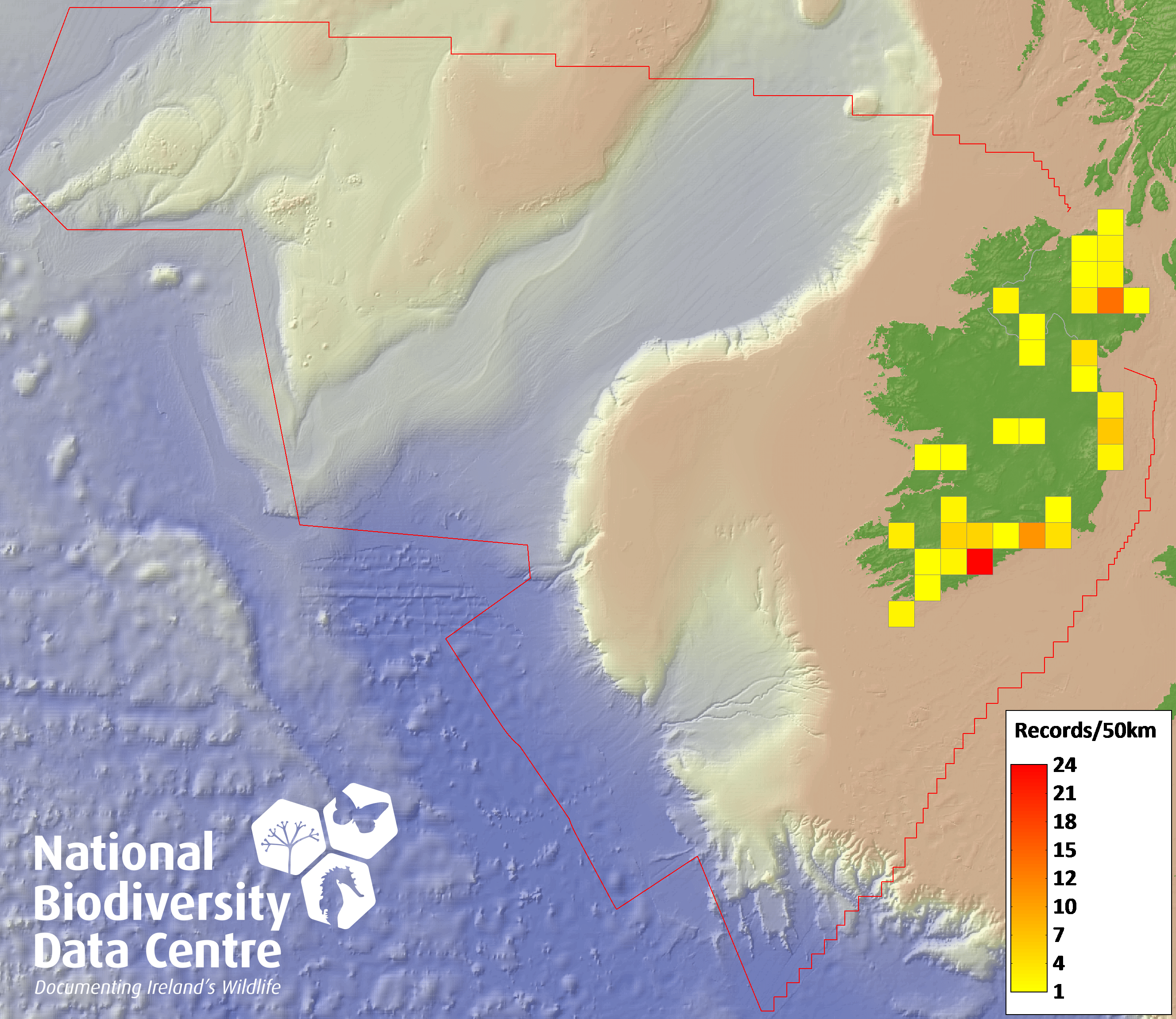 Distribution of the number of records recorded within each 10km grid square (ITM).Marine Map - 50km