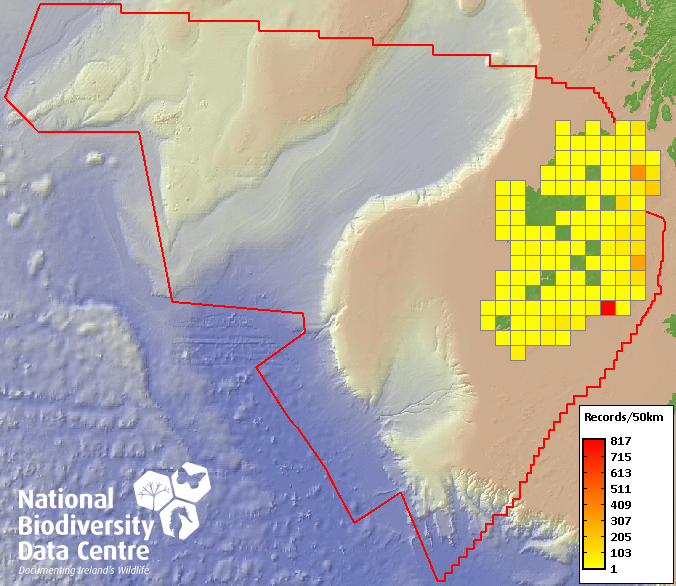 Distribution of the number of records recorded within each 10km grid square (ITM).Marine Map - 50km