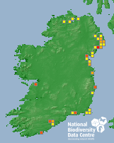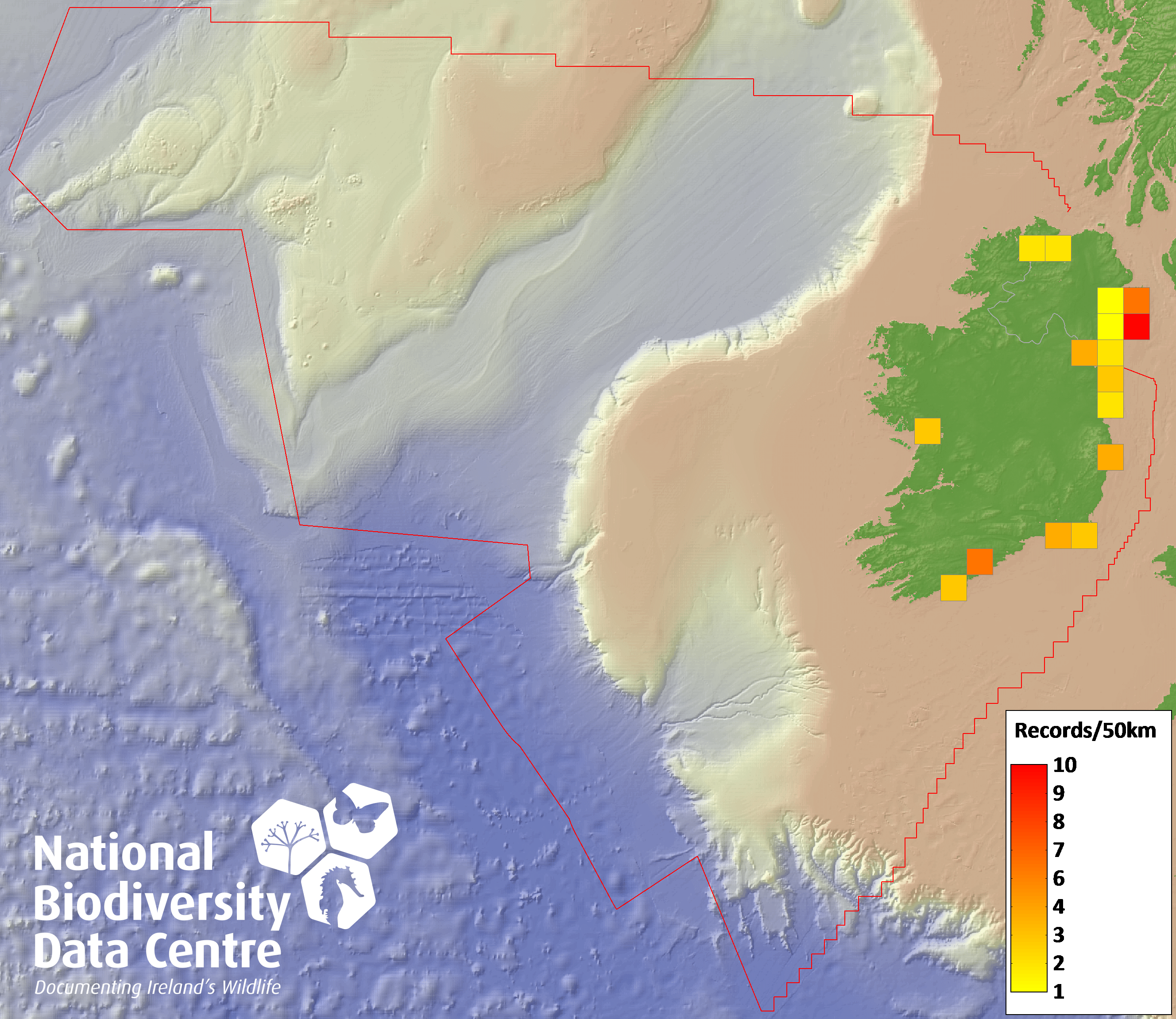 Distribution of the number of records recorded within each 10km grid square (ITM).Marine Map - 50km