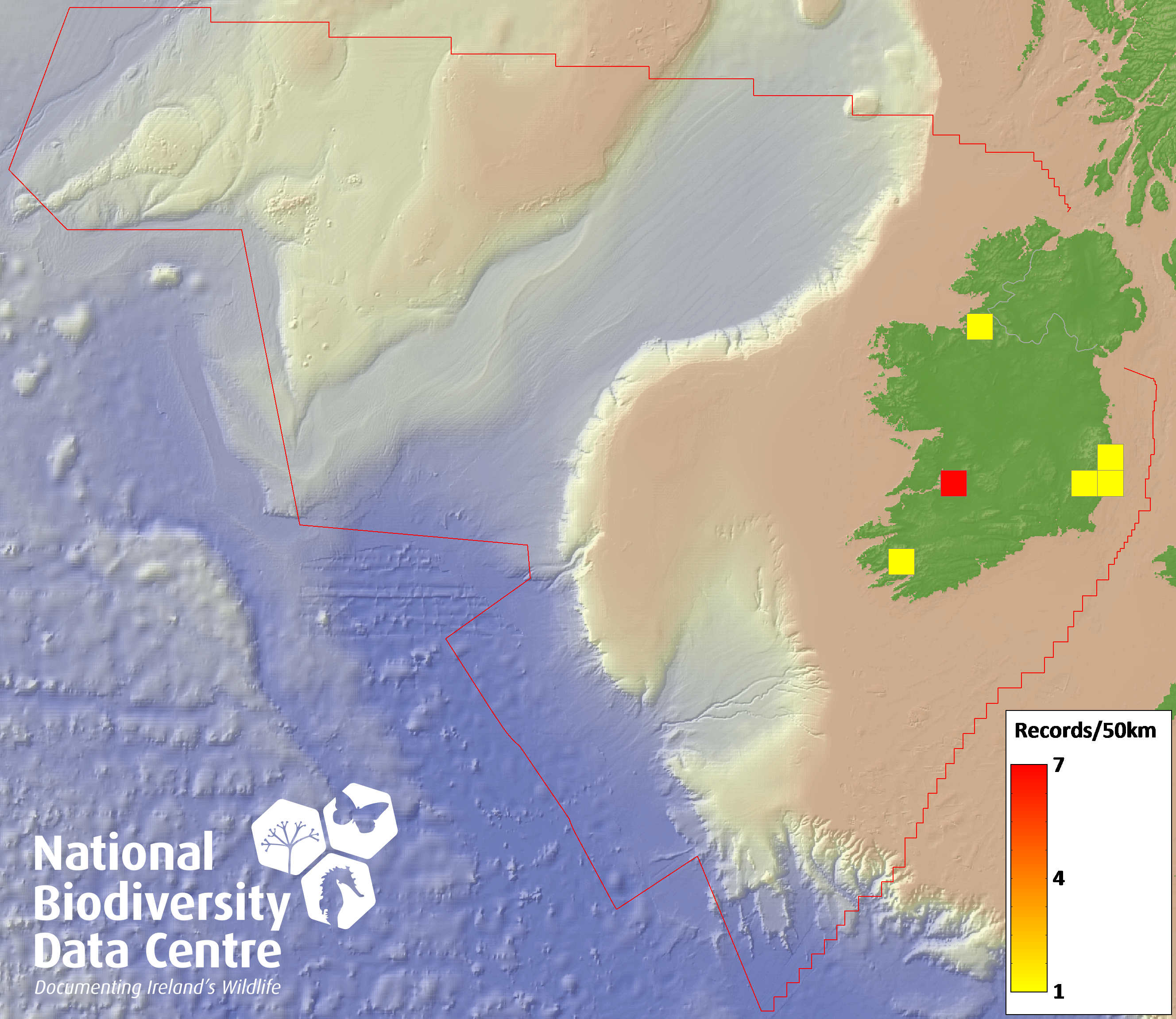 Distribution of the number of records recorded within each 10km grid square (ITM).Marine Map - 50km