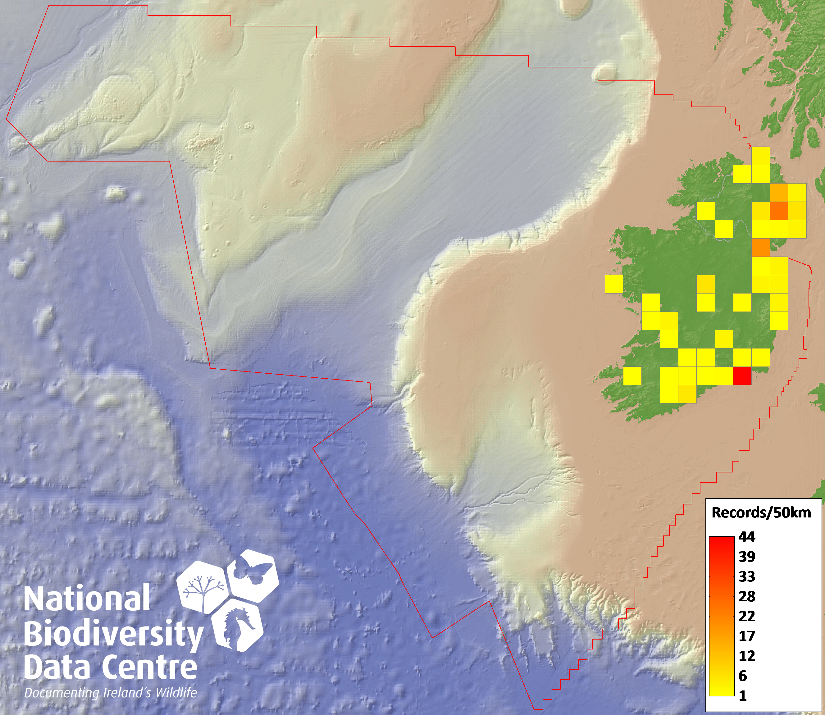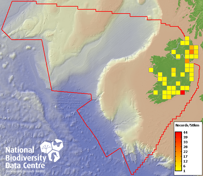 Distribution of the number of records recorded within each 10km grid square (ITM).Marine Map - 50km