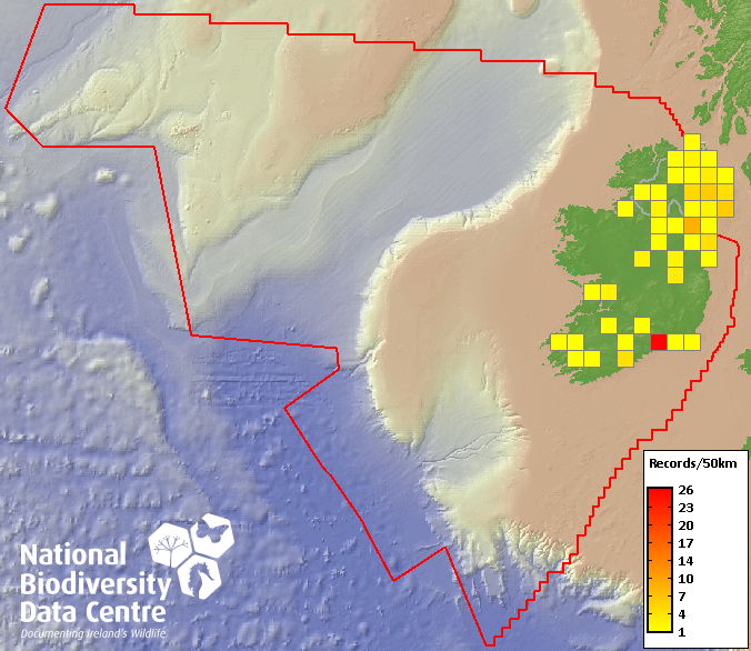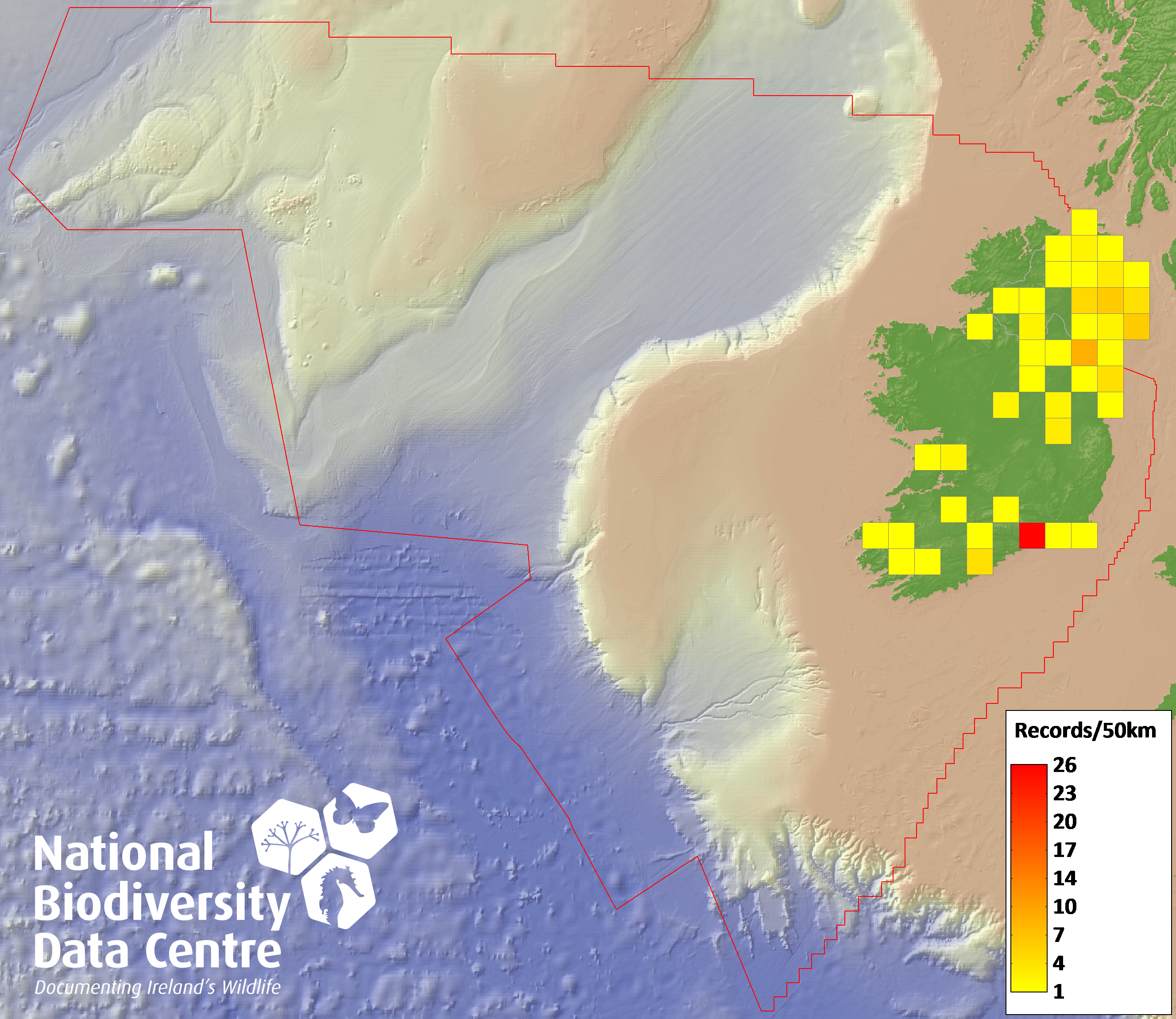 Distribution of the number of records recorded within each 10km grid square (ITM).Marine Map - 50km
