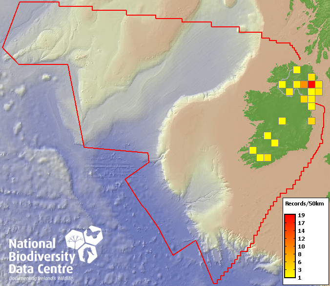 Distribution of the number of records recorded within each 10km grid square (ITM).Marine Map - 50km