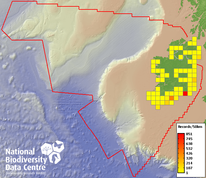 Distribution of the number of records recorded within each 10km grid square (ITM).Marine Map - 50km