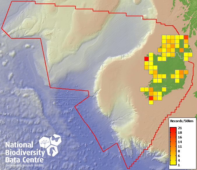 Distribution of the number of records recorded within each 10km grid square (ITM).Marine Map - 50km