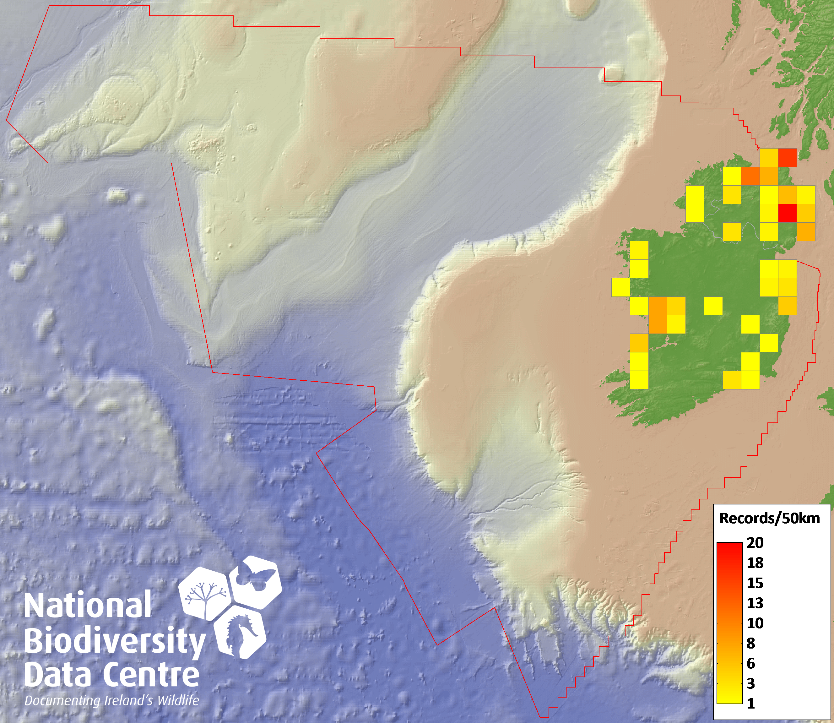 Distribution of the number of records recorded within each 10km grid square (ITM).Marine Map - 50km