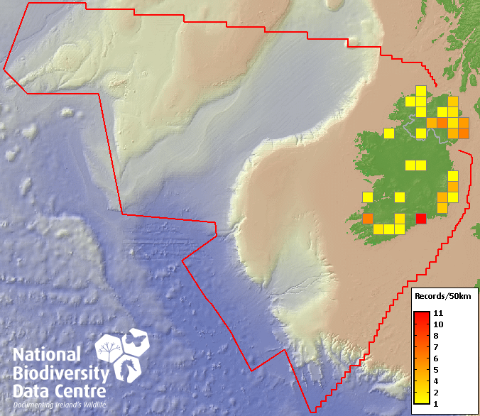 Distribution of the number of records recorded within each 10km grid square (ITM).Marine Map - 50km