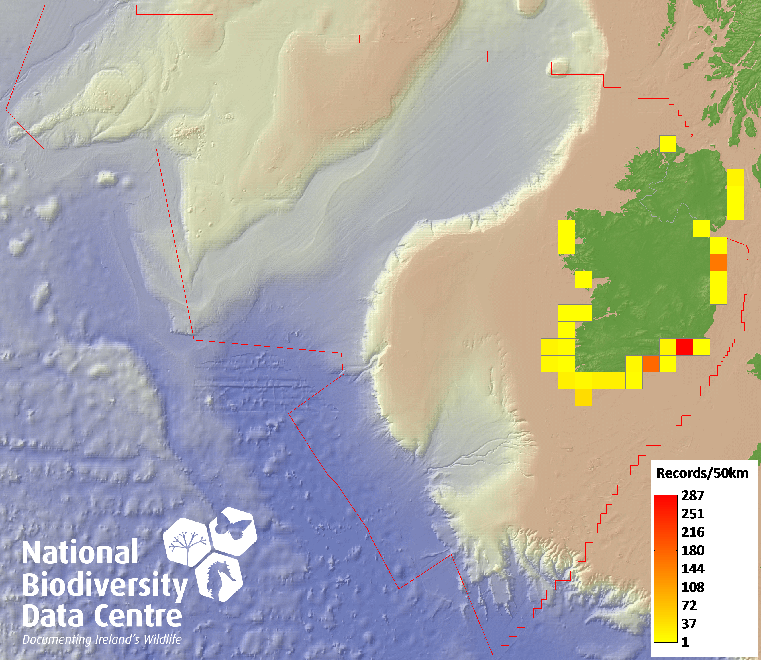 Distribution of the number of records recorded within each 10km grid square (ITM).Marine Map - 50km