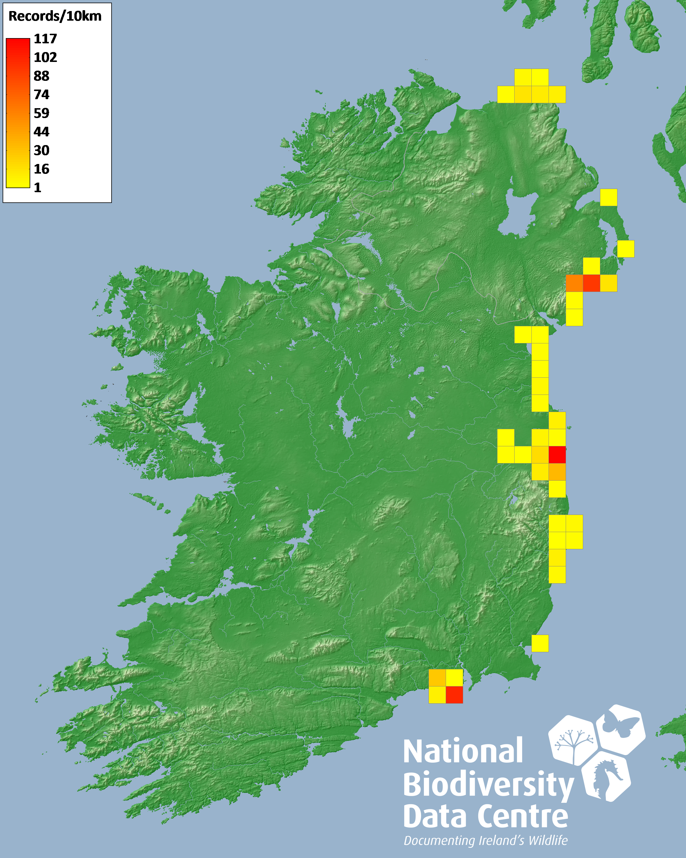 Distribution of the number of records recorded within each 10km grid square (ITM).Marine Map - 50km