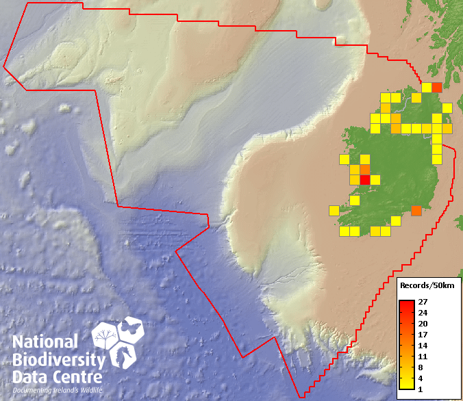 Distribution of the number of records recorded within each 10km grid square (ITM).Marine Map - 50km