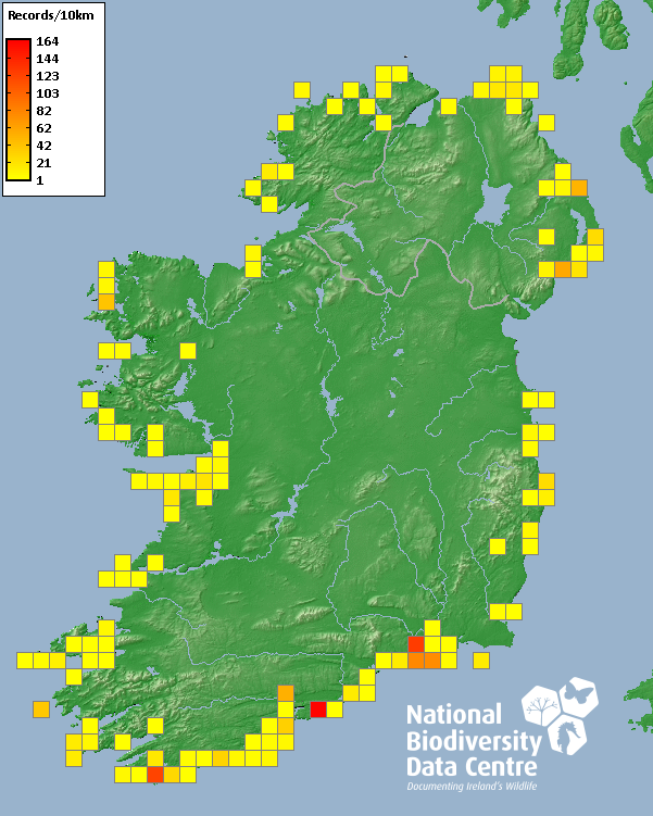 Distribution of the number of records recorded within each 10km grid square (ITM).Marine Map - 50km