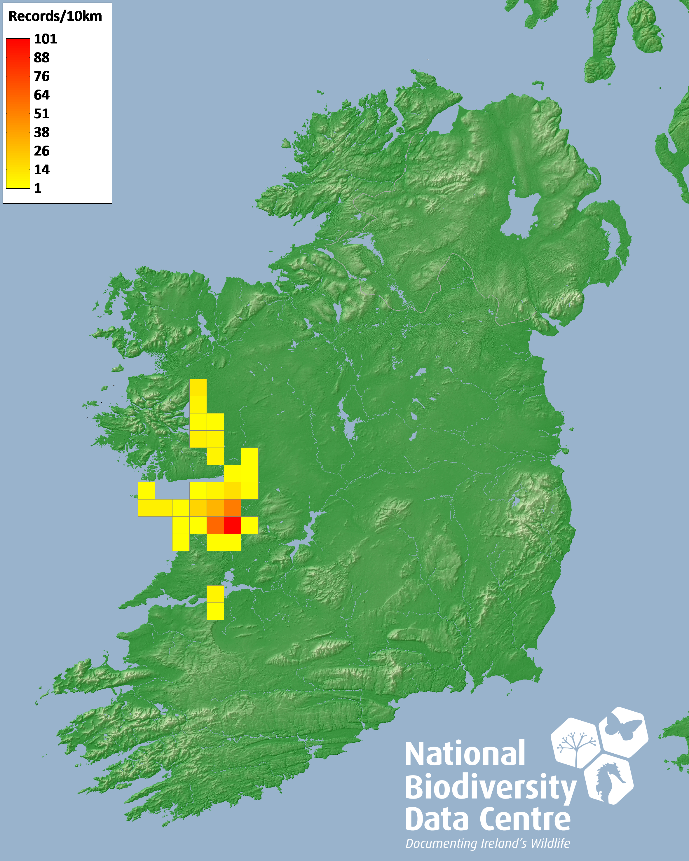 Distribution of the number of records recorded within each 10km grid square (ITM).Marine Map - 50km