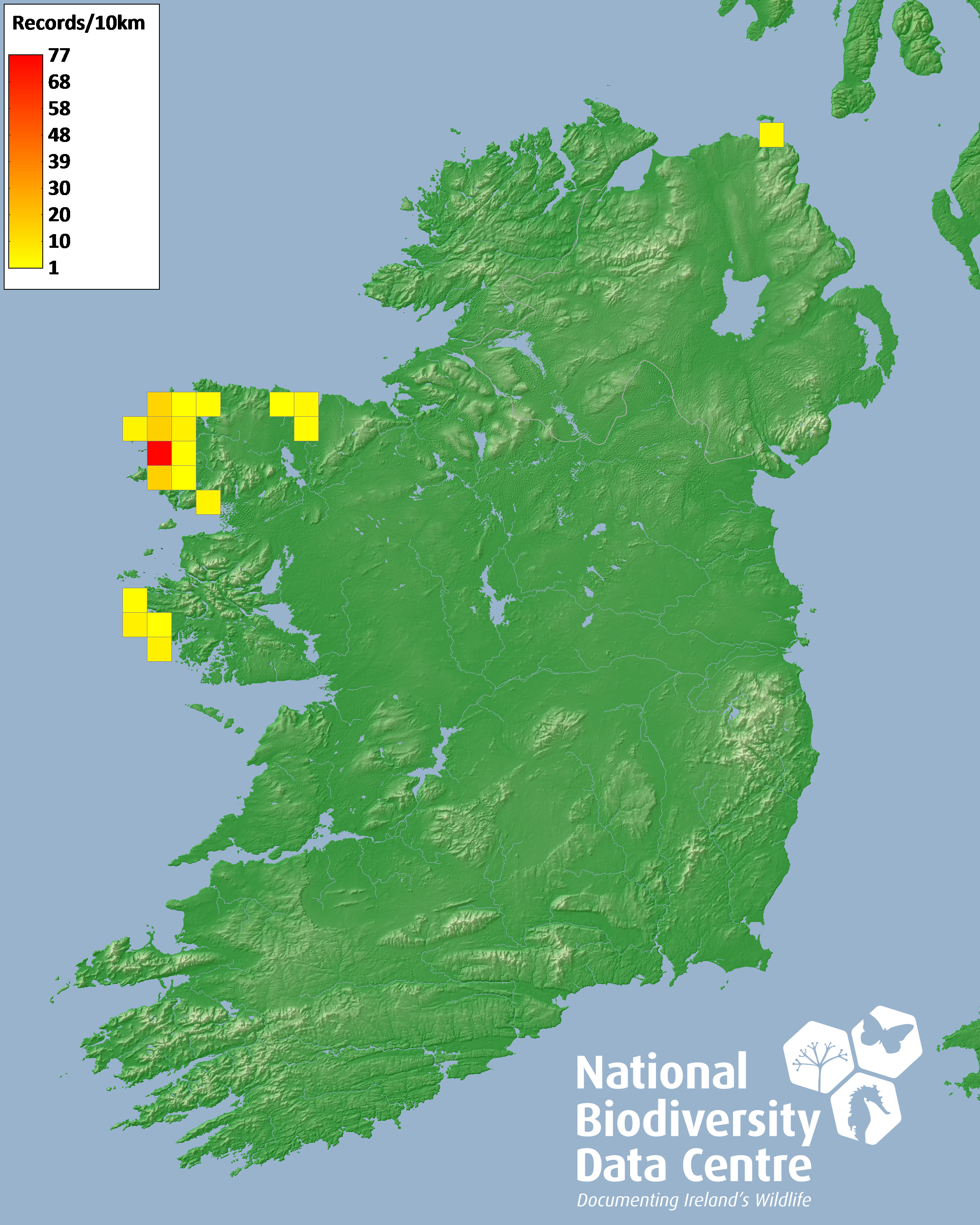 Distribution of the number of records recorded within each 10km grid square (ITM).Marine Map - 50km