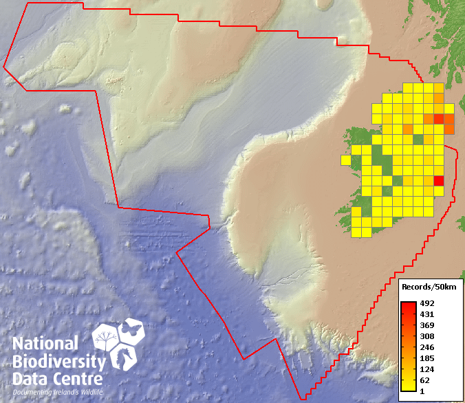 Distribution of the number of records recorded within each 10km grid square (ITM).Marine Map - 50km