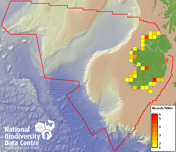 Distribution of the number of records recorded within each 10km grid square (ITM).Marine Map - 50km