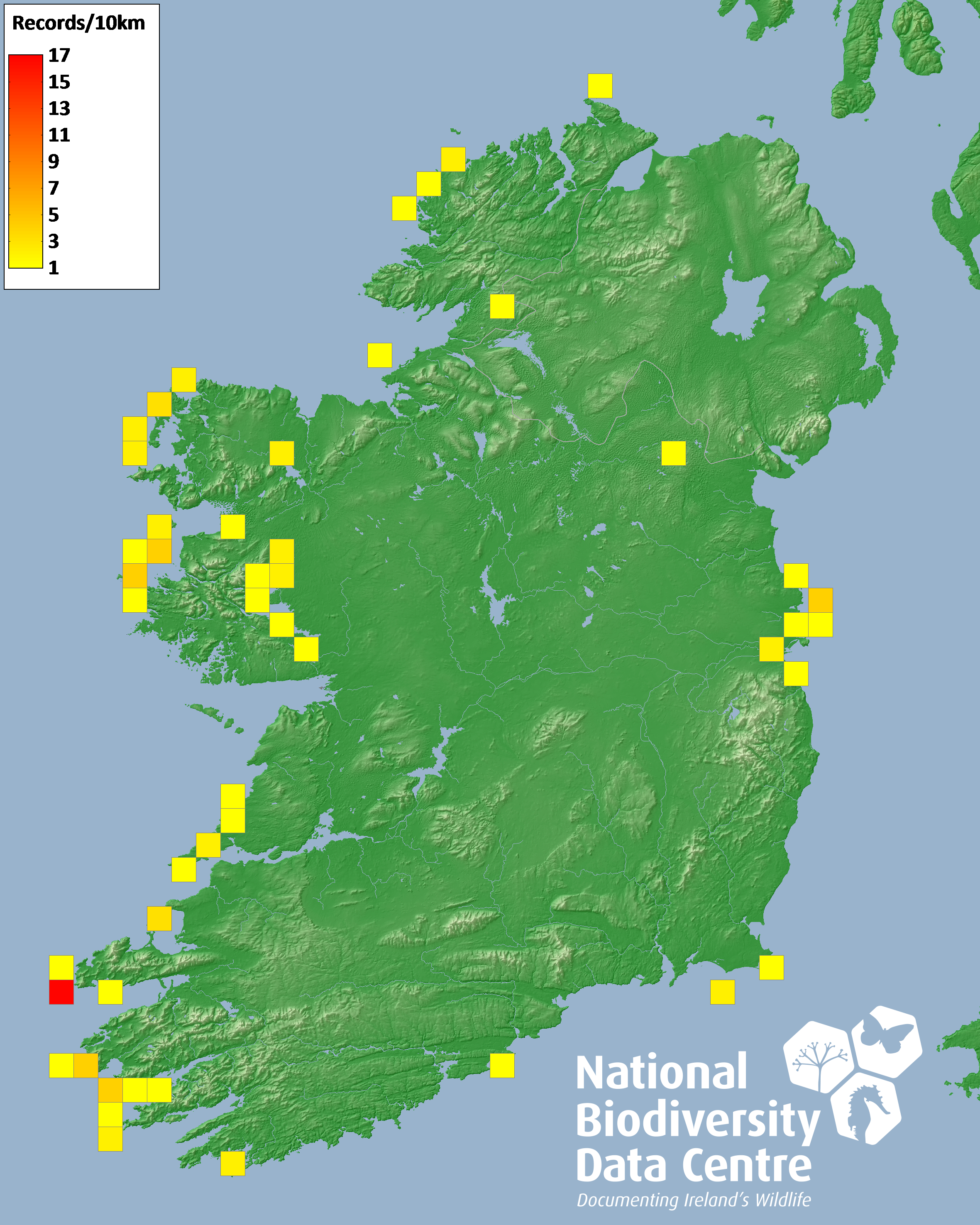 Distribution of the number of records recorded within each 10km grid square (ITM).Marine Map - 50km
