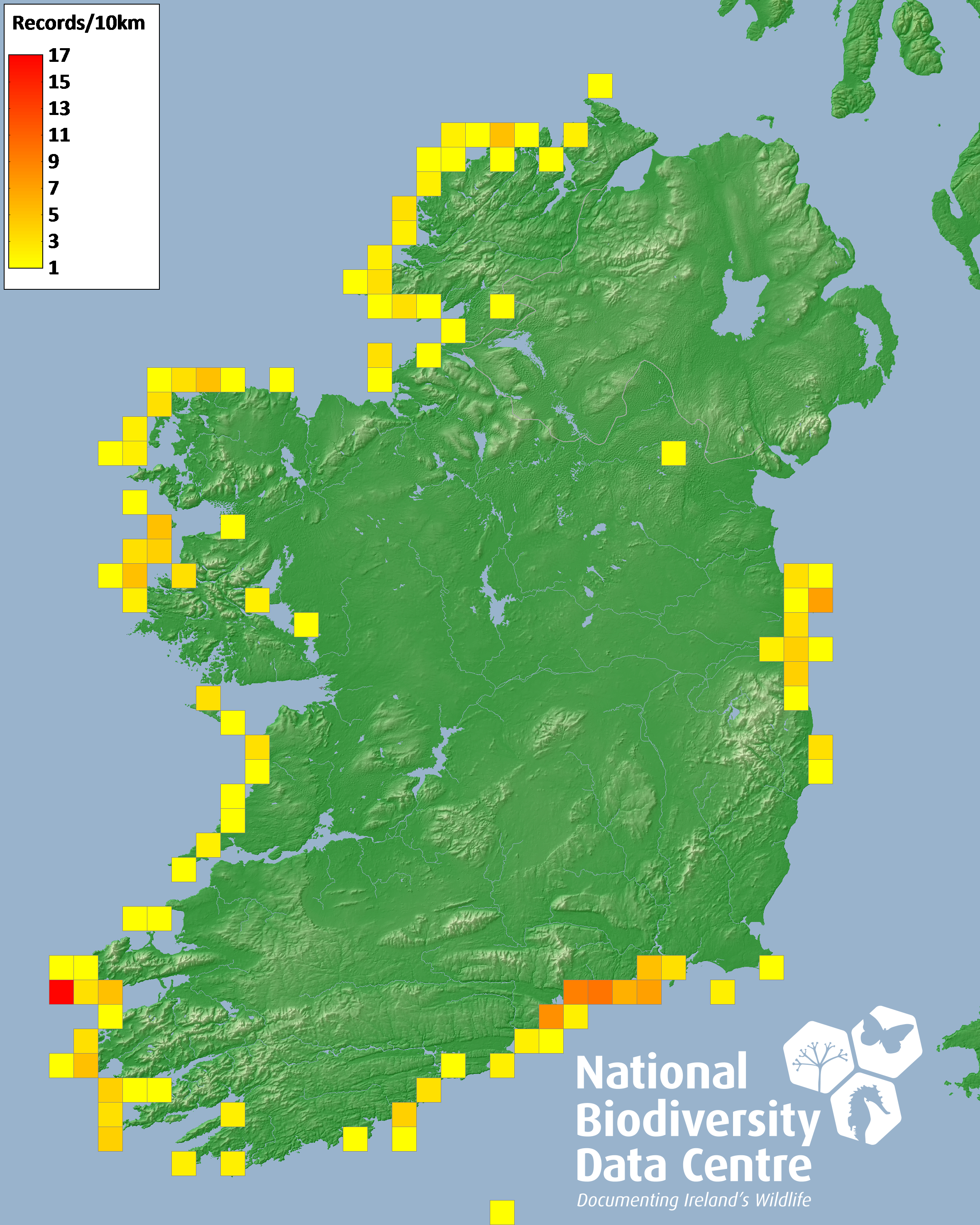 Distribution of the number of records recorded within each 10km grid square (ITM).Marine Map - 50km