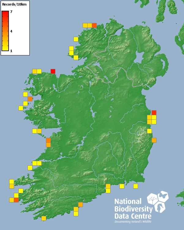 Distribution of the number of records recorded within each 10km grid square (ITM).Marine Map - 50km