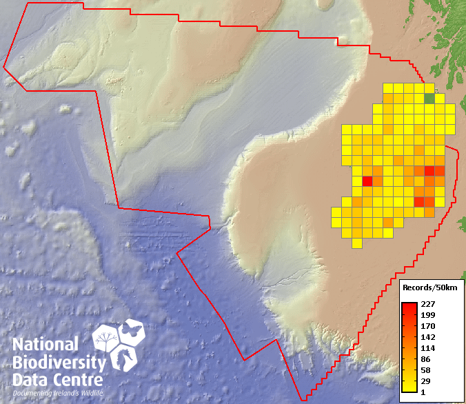 Distribution of the number of records within each 10km grid square (ITM).Marine Map - 50Km