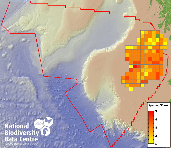 Distribution of the number of species recorded within each 10km grid square (ITM).Marine Map - 50Km