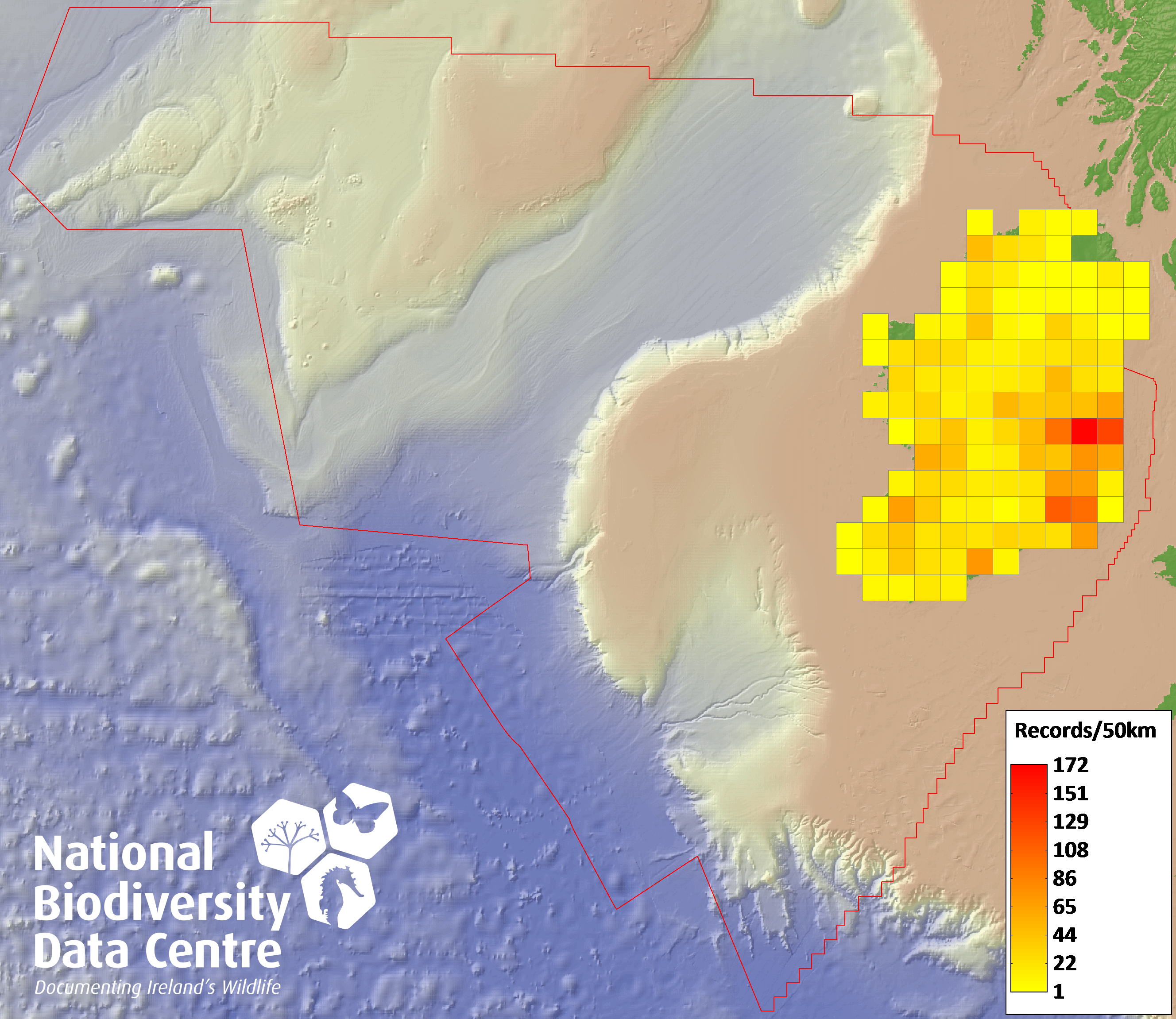 Distribution of the number of records recorded within each 10km grid square (ITM).Marine Map - 50km