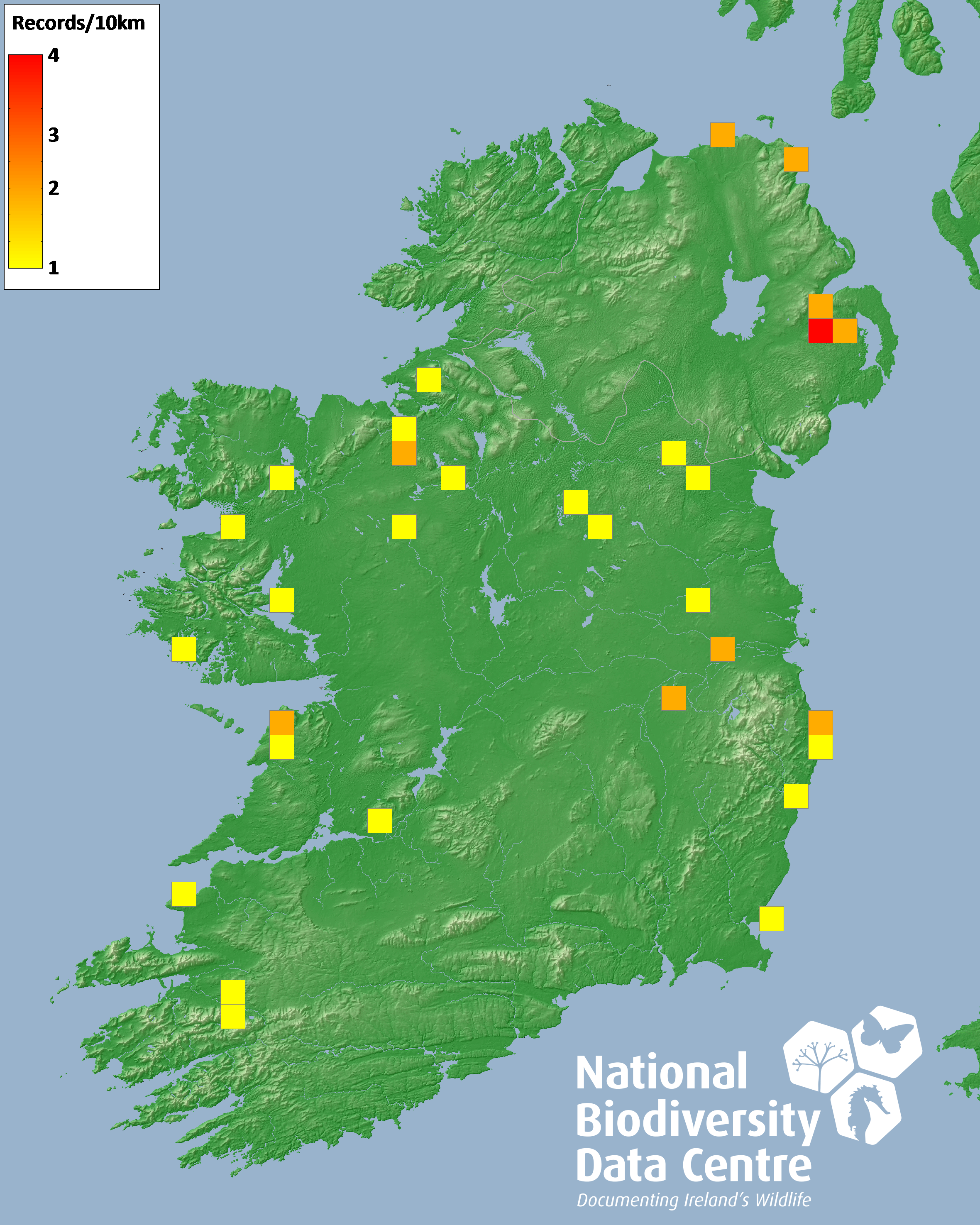 Distribution of the number of records recorded within each 10km grid square (ITM).Marine Map - 50km