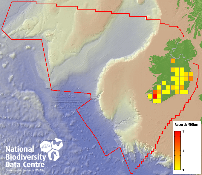 Distribution of the number of records recorded within each 10km grid square (ITM).Marine Map - 50km