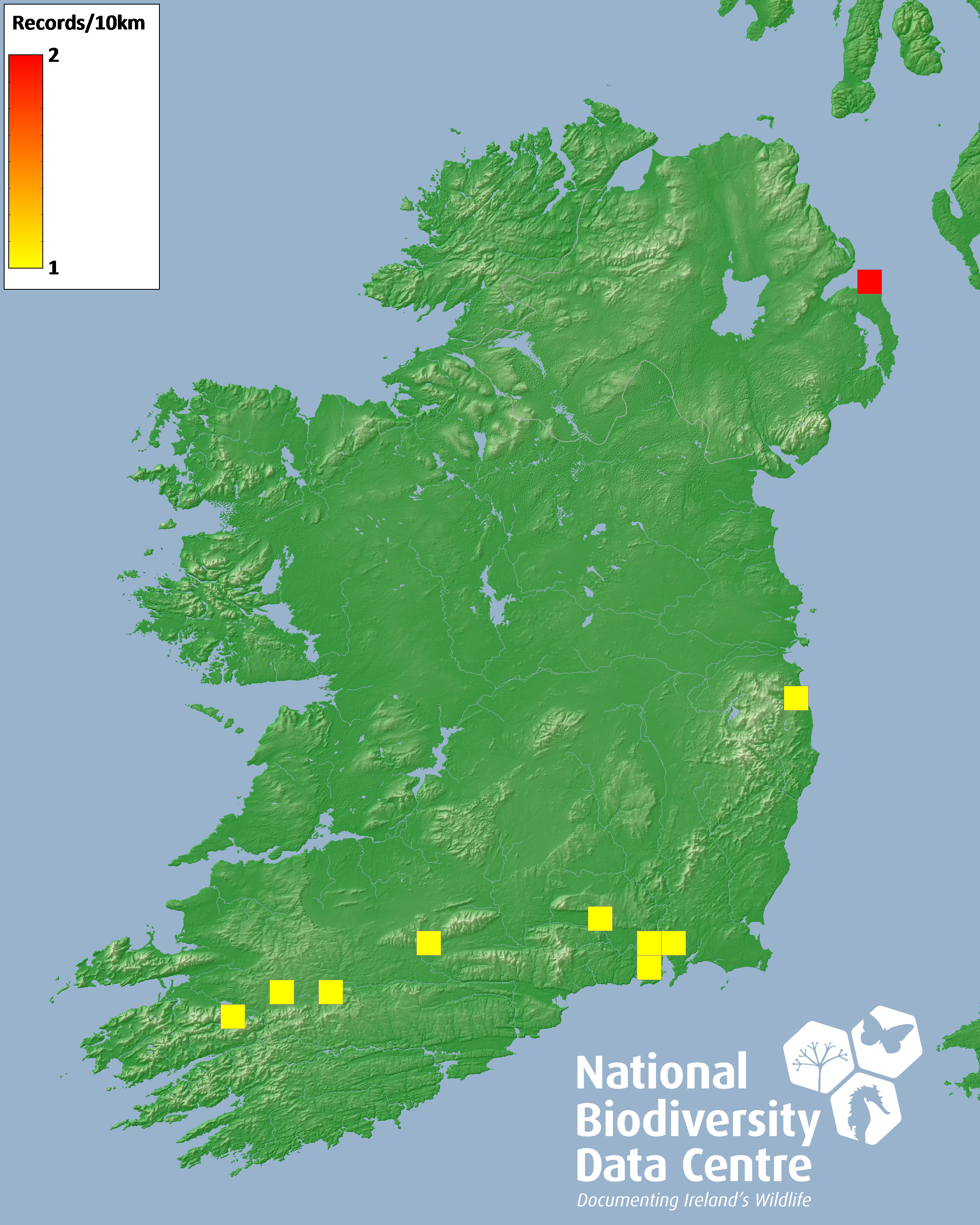Distribution of the number of records recorded within each 10km grid square (ITM).Marine Map - 50km