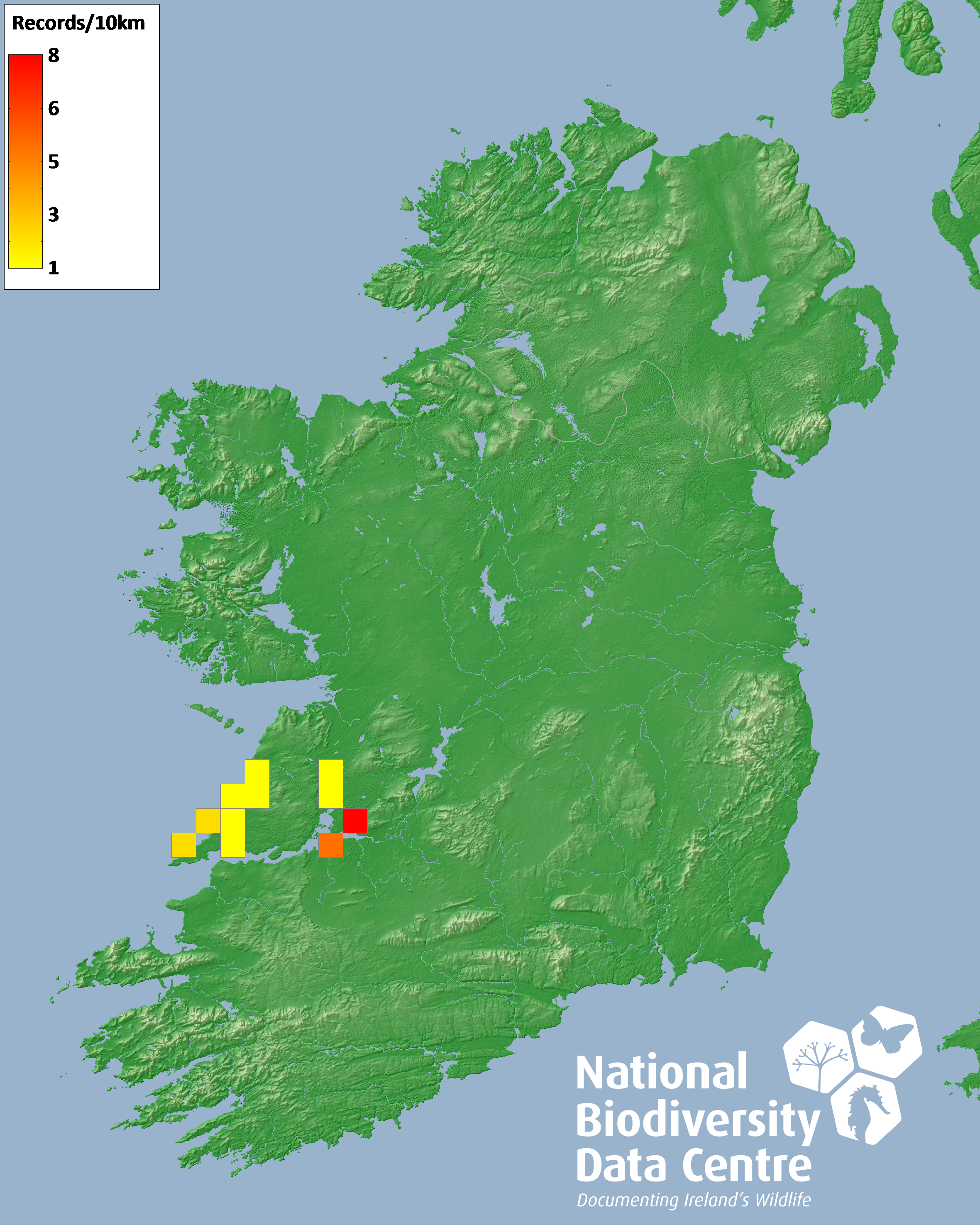 Distribution of the number of records recorded within each 10km grid square (ITM).Marine Map - 50km