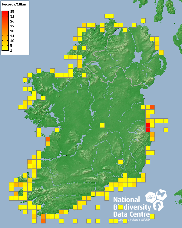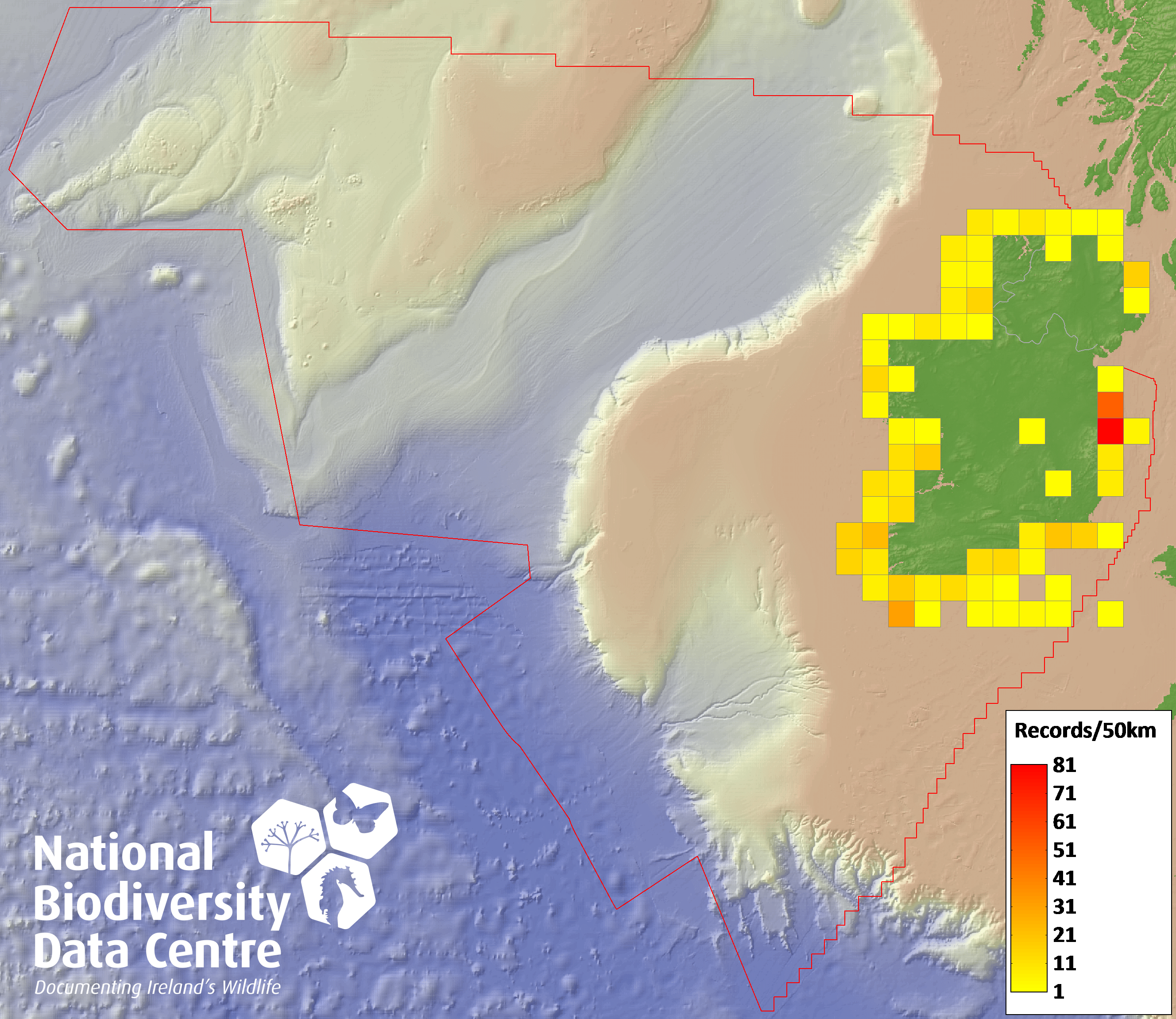Distribution of the number of records recorded within each 10km grid square (ITM).Marine Map - 50km