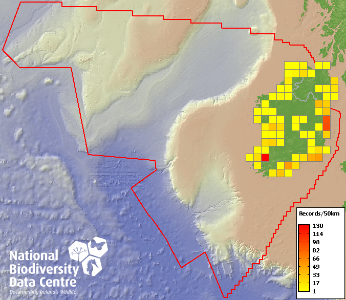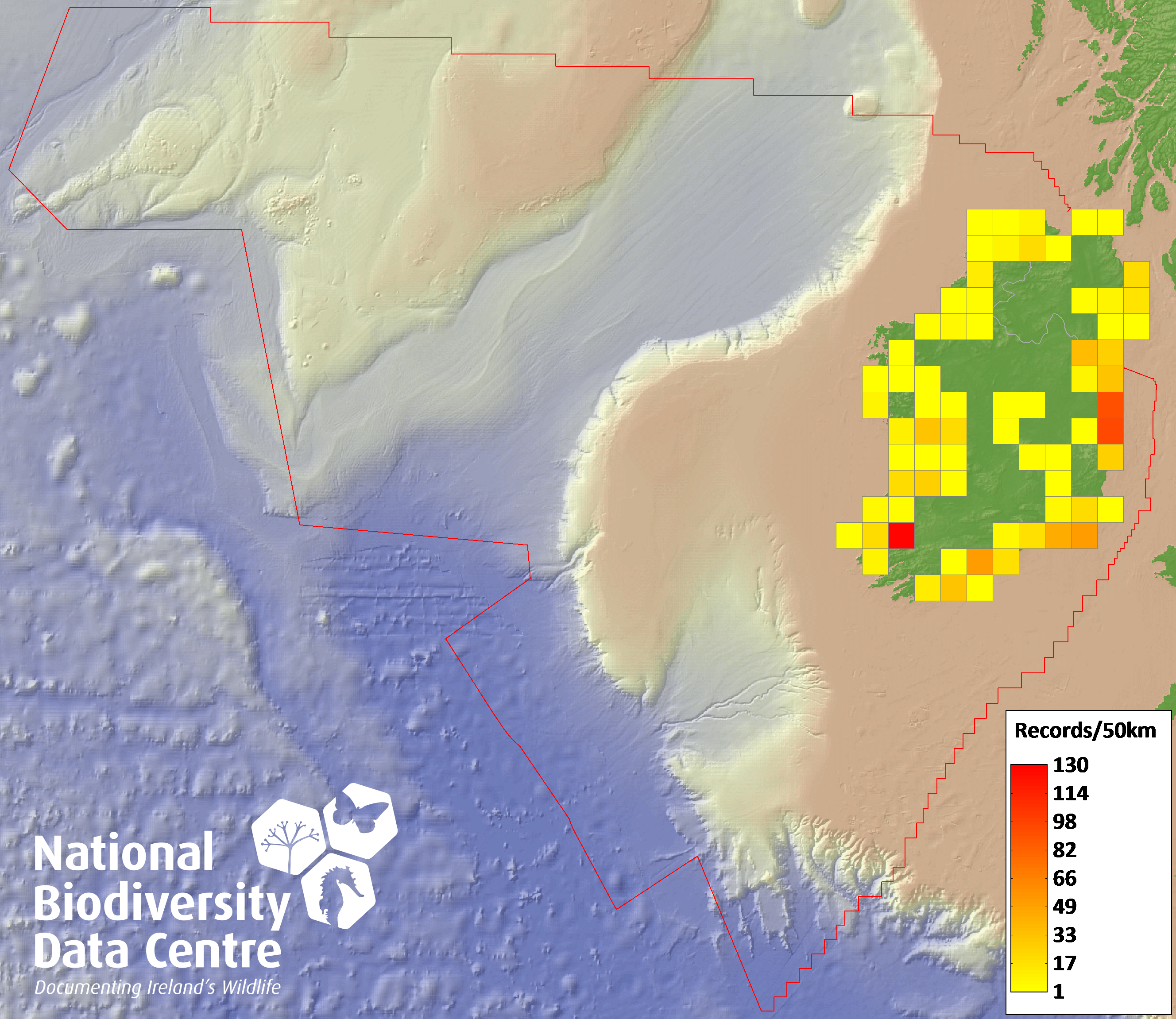 Distribution of the number of records recorded within each 10km grid square (ITM).Marine Map - 50km