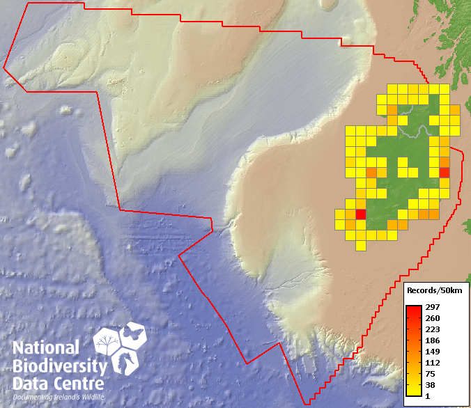 Distribution of the number of records recorded within each 10km grid square (ITM).Marine Map - 50km