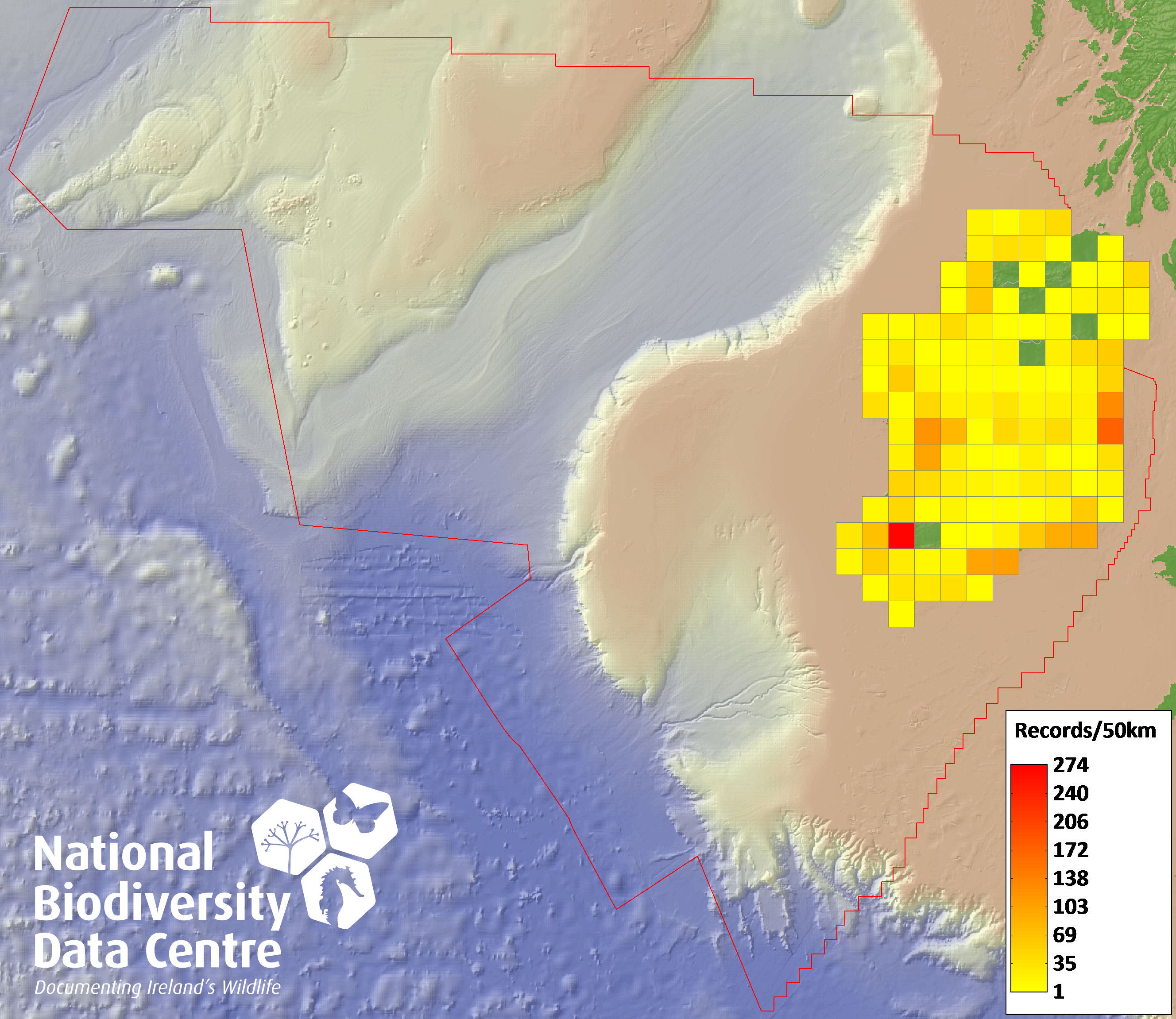 Distribution of the number of records recorded within each 10km grid square (ITM).Marine Map - 50km